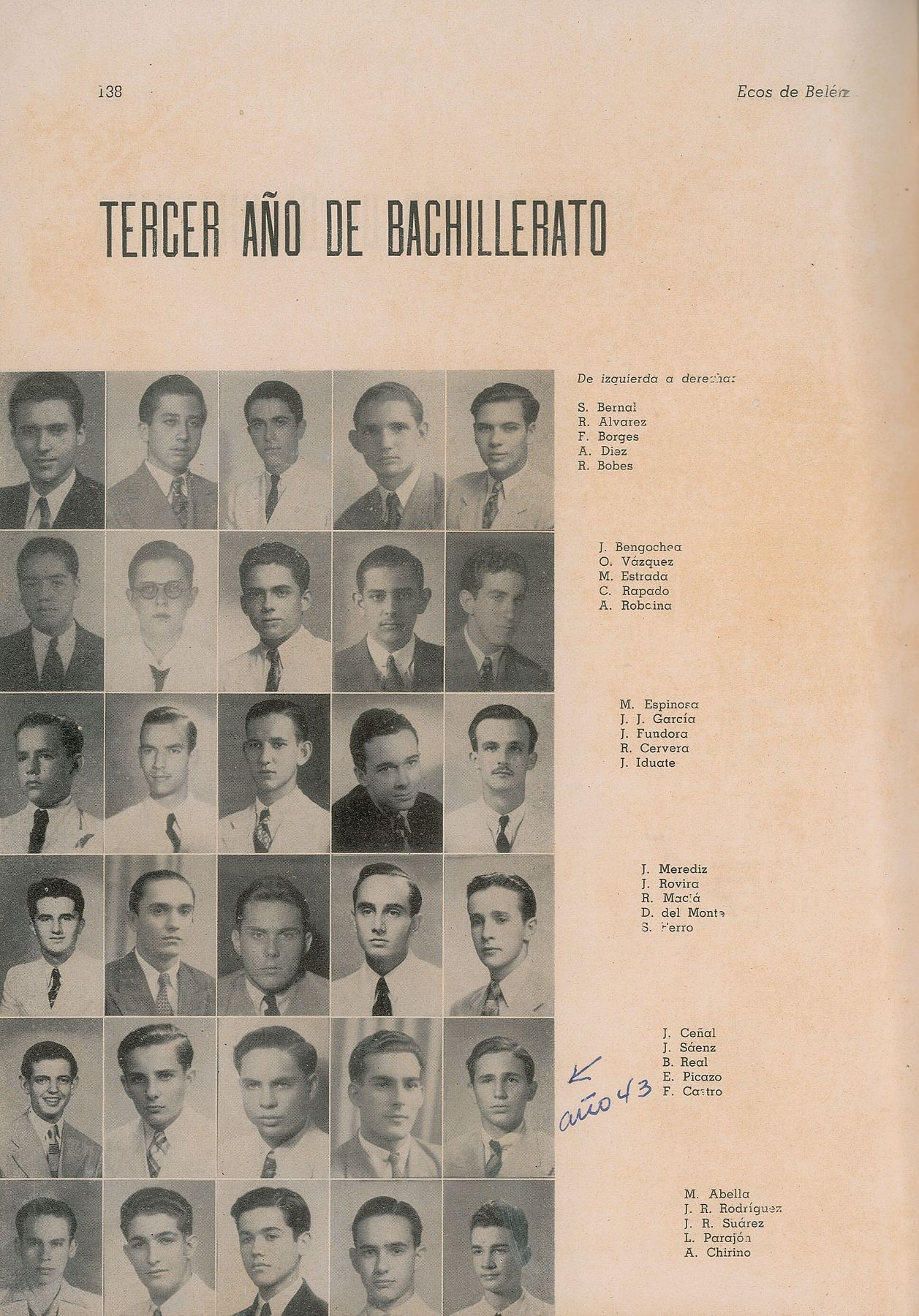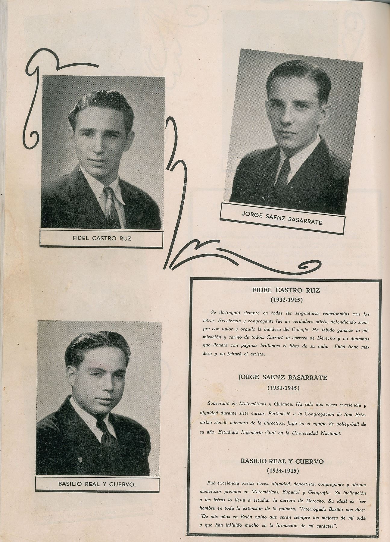 Three unsigned "Ecos de Belen" yearbooks from Fidel Castro's teenage years, dating to 1943, 1944, and 1945. In the 1943 yearbook, Castro is pictured as a member of the basketball team, soccer team, and third-year class. In 1944, he is again shown with the basketball team and as part of the fourth-year class. In the 1945 yearbook, he is shown as a member of the graduating class, with a biographical blurb that praises his academic and athletic abilities, and notes (translated): "He will study law and we do not doubt that he will fill the book of his life with brilliant pages." All have been rebound and are in overall very good condition.