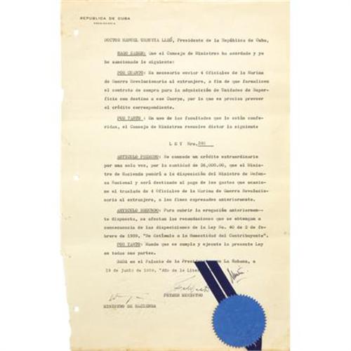 <B>Fidel Castro and Manuel Urrutia Lleo, Presidents of Cuba, Document Signed,</B></I> one page, 9" x 13.75", Havana, June 19, 1959, in Spanish. Light browning at the edges, a couple of minor tears and an uneven left edge where it was removed from a binding, else near fine. The document is "<I>Ley Nro. 395</B></I>" of the Republic of Cuba in the "<I>Ano de la Liberacion</B></I>". It is signed by Manuel Urrutia Lleo as president and Fidel Castro as prime minister. Manuel Urrutia served as president in the first revolutionary government of 1959. After only six months, Urrutia resigned his position due to a series of disputes with revolutionary leader Fidel Castro and emigrated to the United States.<BR><BR><b>Shipping:</b> Flat Material, Small (<a target="_blank" href="http://www.heritageauctions.com/common/shipping.php">view shipping information</a>)