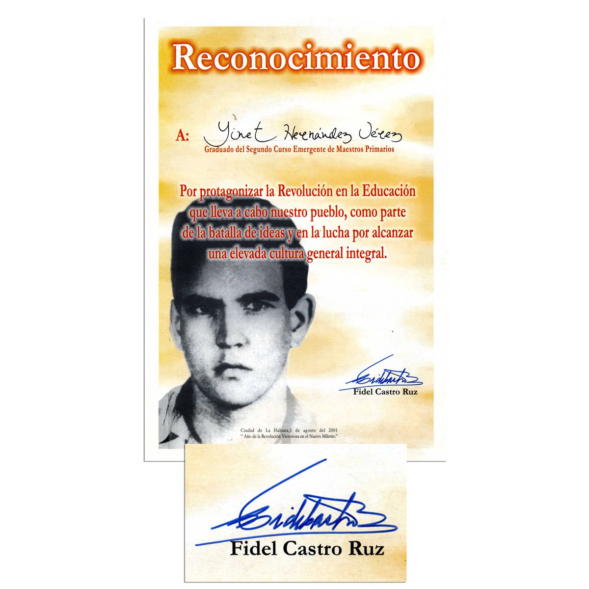 Fidel Castro signed poster, dated 1 August 2001. Castro signs the poster sized award, presented to Yinet Hernandez Jerez, for her participation in the ''Revolution in Education.'' A young Castro looks out from behind the poster's Spanish text. Minor soiling to 11.75'' x 16.5'' poster. Overall in very good condition with a clean, bright blue signature.