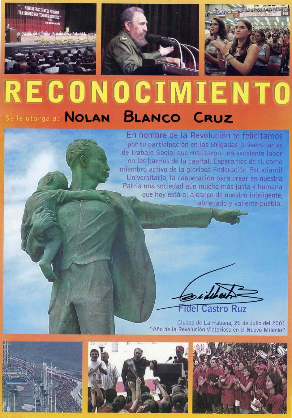 Fidel Castro signed poster, issued to graduates of the Cuban ''University Social Worker Brigades.'' Dated ''26 Julio 2001'' poster is awarded to Nolan Blanco Cruz and translates in part, ''In the name of the Revolution, with gratitude for your participation in…creating in our country one society that is much more just and humane… '' Very vividly colored poster measures 11.75'' x 16.5''. Light crease and very light foxing to bottom, else excellent.