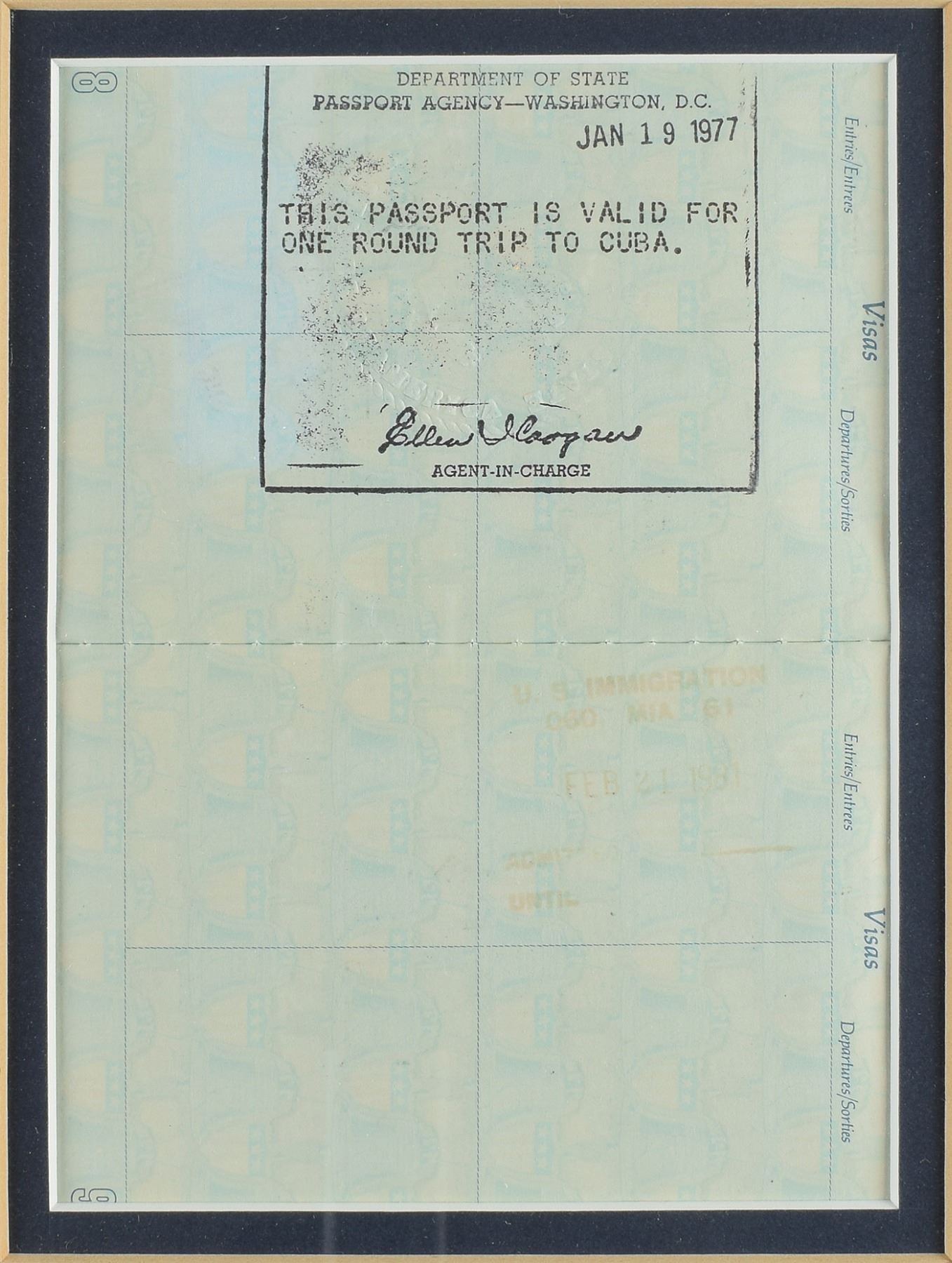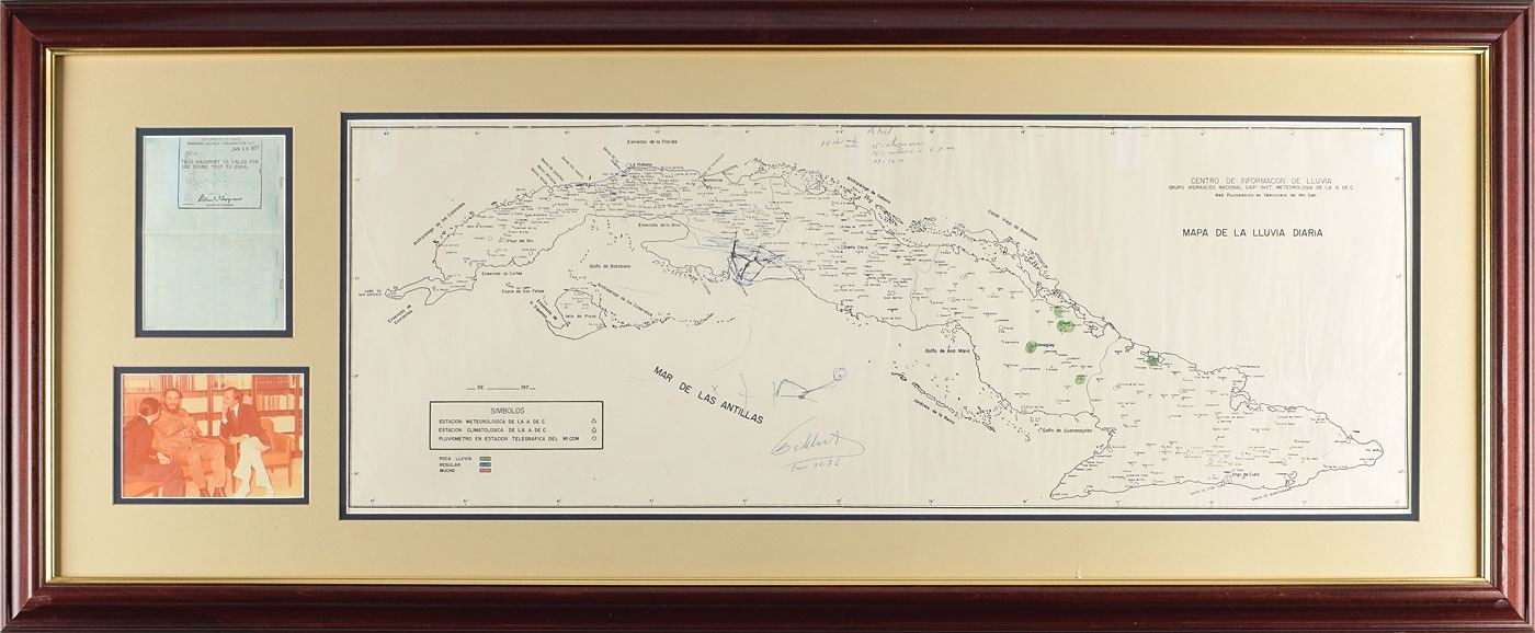 Amazing and historically significant 35 x 13 map of Cuba hand-annotated in blue ballpoint by Fidel Castro to represent the Bay of Pigs operation, signed below, "Fidel Castro, Enero 30, 76." The map, which is intended to provide information on daily rainfall, has been copiously annotated by Castro to show the Bay of Pigs invasion from his perspective: at the top, he writes dates from April 14–17, with brief notes on what transpired each day in 1961; at the bottom, he draws a diagram of the US fleet off the Cuban coast; and at the "Bahia de Cochinos [Bay of Pigs]" he sketches the route of the invasion force. Nicely double-matted and framed with the passport page that allowed the recipient (W.C. Moyers) to travel from the United States to Cuba in 1977, as well as an image of Castro being interviewed, to an overall size of 51 x 21. In fine condition, with scattered light creasing and light overall wrinkling.