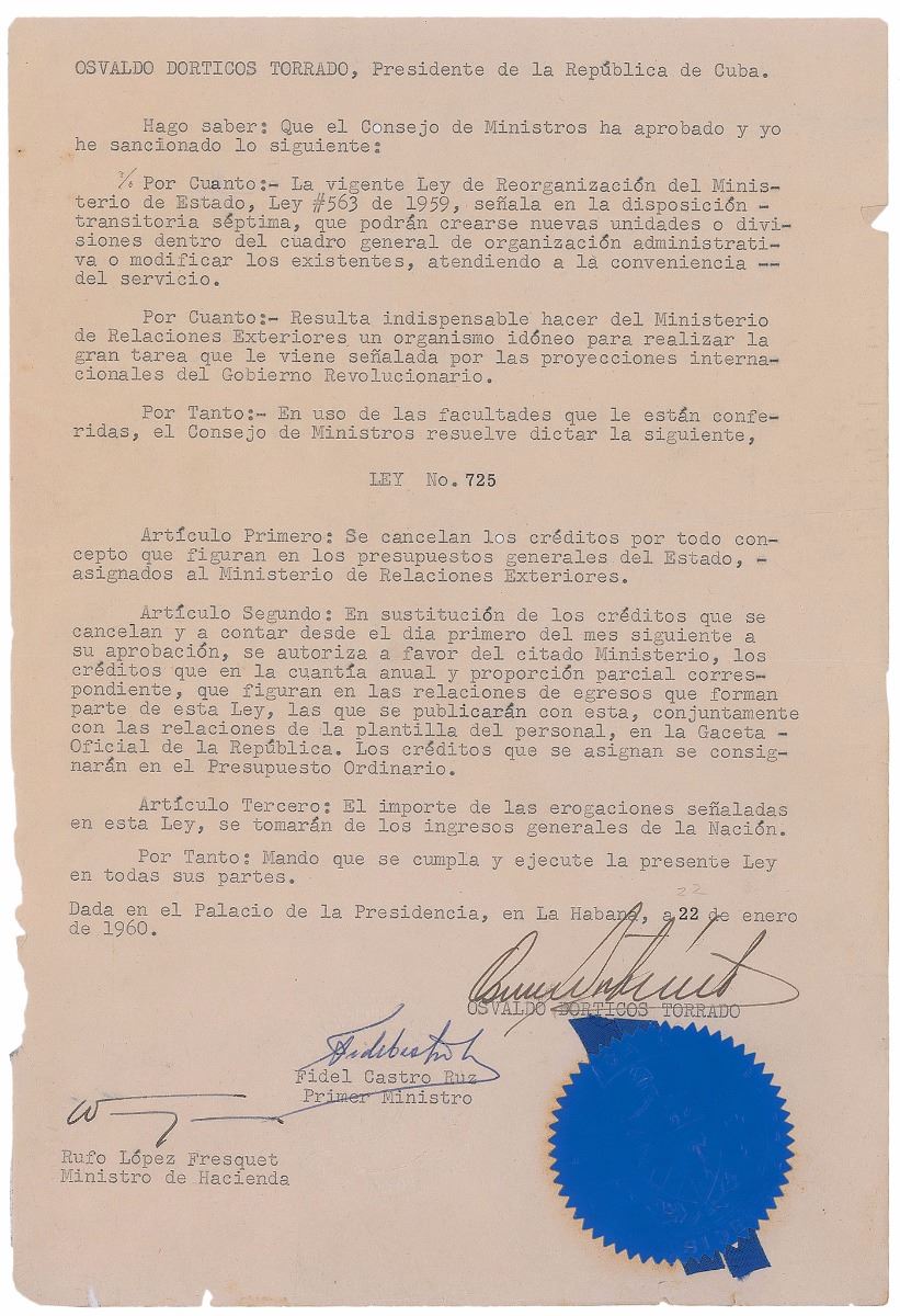 DS in Spanish, one page, 7.75 x 11.25, January 22, 1960. Untranslated document concerning the reorganization of the Ministry of State. Signed at the conclusion by Fidel Castro as prime minister and countersigned by Osvaldo Dorticos Torrado as president. The blue seal and ribbon affixed below the signatures remain intact, with the ribbon potentially trimmed. Expected document wear and chipping and small tears to edges, otherwise fine condition.