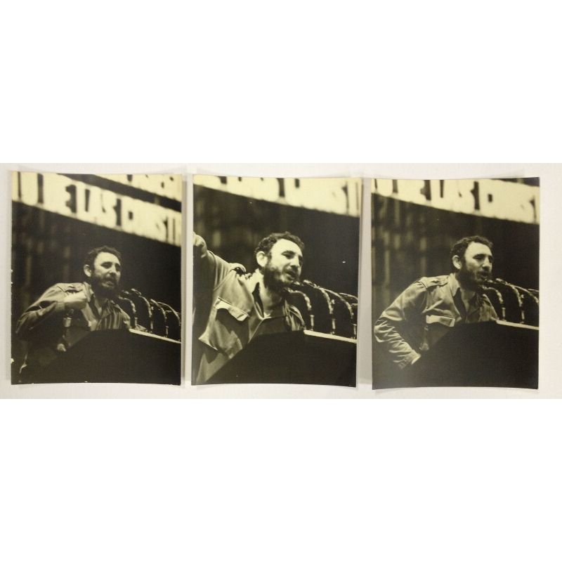 A set of three original photographic prints of Fidel Castro making a political address.