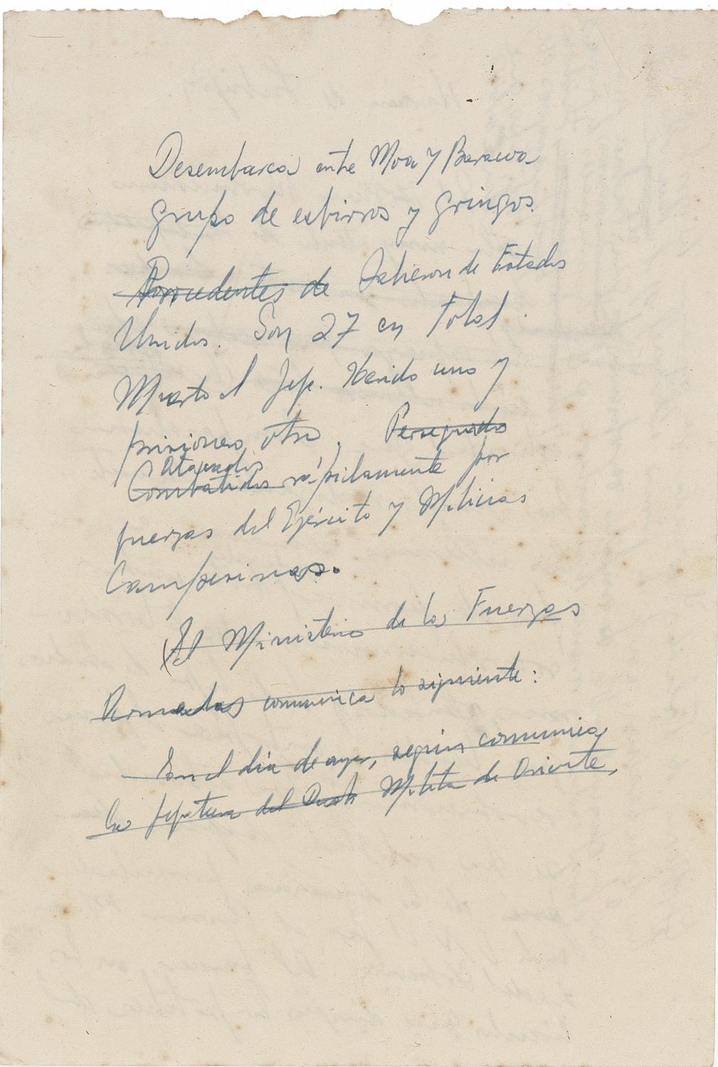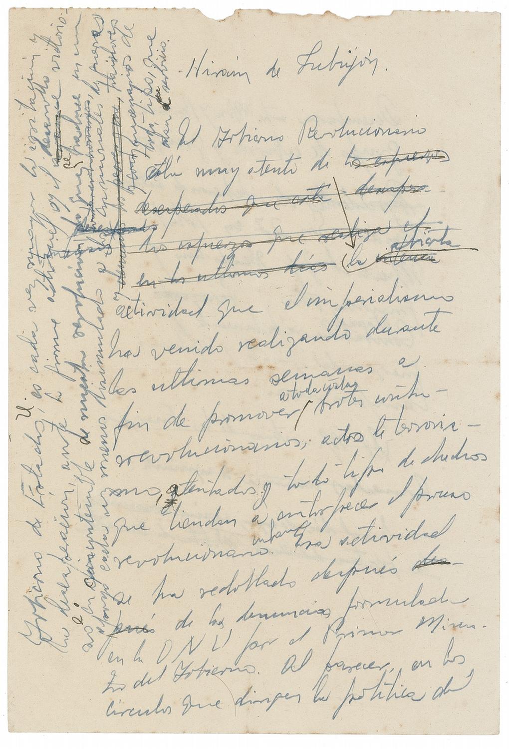 Autograph speech notes, in Spanish, on both sides of a 6 x 9 off-white sheet. Notations read (translated): “Hiram of Lubrijón…The Revolutionary Government is very aware of the desperate efforts that is…the efforts that reflect in the last days [lined out on text] the open…activity that the imperialism has been realizing during the last weeks in order to promote at all cost…revolutionaries, terrorism acts, murder attempts and all type of fights that have a tendency to interfere with the revolutionary process…That activity has been doubled after…reports have been expressed to the ONU to the Prime Minister of the Government. It seems like they are worried within the Justice department of the United States Government, every time the anger and desperation increases, because of our solid activity and the victorious and uncontrollable development of our revolution that translates each time in a less dissimulated support of anti-revolutionaries, the war criminals and the worse…traitors, mercenaries of all type that…of service. Disembark between Moa and Baracoa…group of expatriates and gringos coming from…They left the United States. They are 27 in total Leader dead. One hurt and another prisoner…quickly attacked combated…by the army forces and militia’s farmers…The Ministry of the Armed Forces communicates the following: In the day of yesterday…communicates the headquarters of…Militia of the West.” In very good condition, with intersecting folds, a few creases and wrinkles, several portions of text lined out, chipping to top edge, and a bit of light foxing.