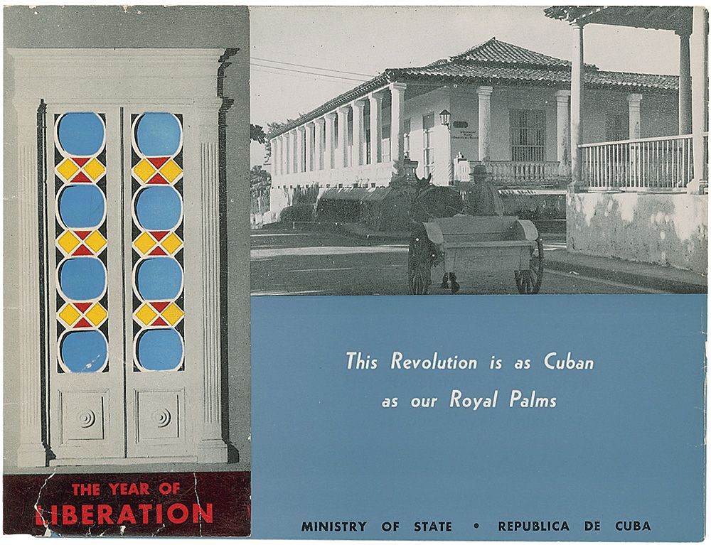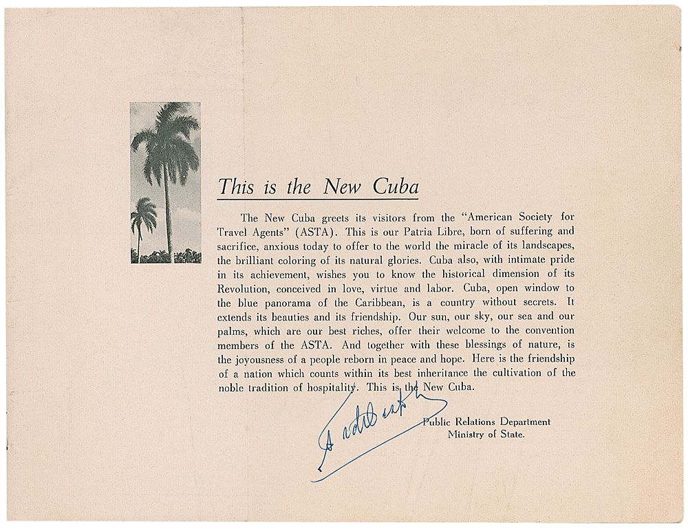 Propaganda booklet for The Year of Liberation by the Ministry of State-Republic de Cuba, 9.5 x 7.25, signed on the first page under the opening statement entitled, ‘This is the New Cuba,’ in blue ink, “Fidel Castro.” In very good condition, with a few light creases, one of which passes through the end of the signature, light toning, some scattered light rubbing, and a tear to the front cover.