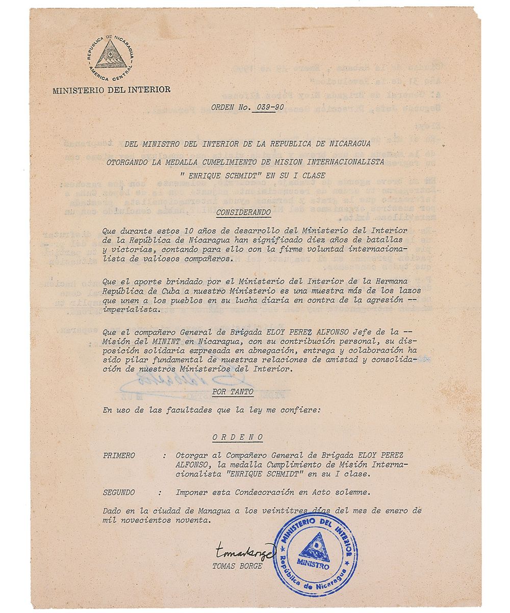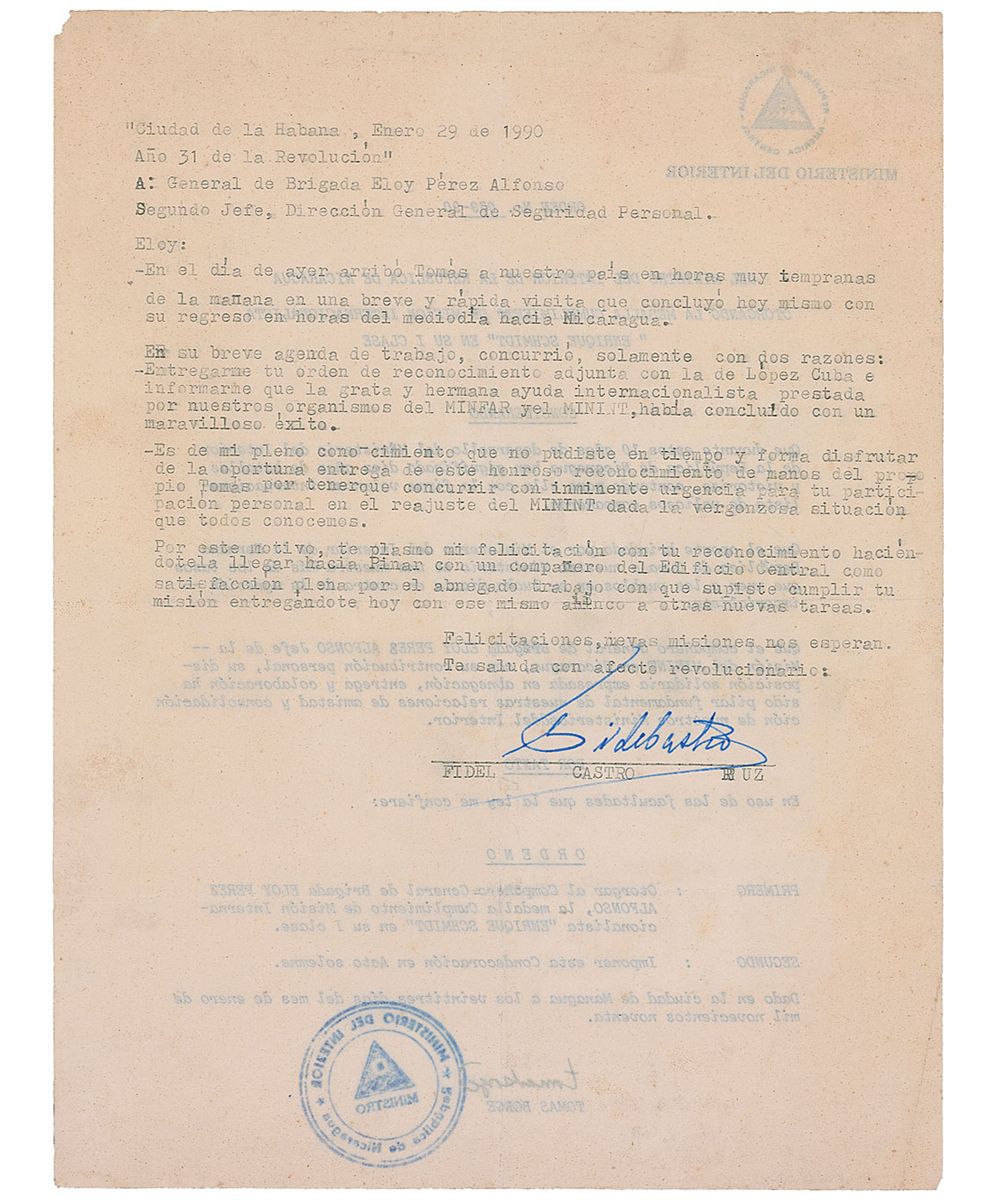 TLS in Spanish, one page, 8 x 10.75, January 29, 1990. Untranslated letter to Eloy Perez Alfanzo regarding a medal bestowed upon him by the country of Nicaragua, which is printed on the opposite side of the letter. In fine condition, with intersecting folds, and some light show-through from text, signature, and stamp on reverse. Accompanied by the original transmittal envelope.