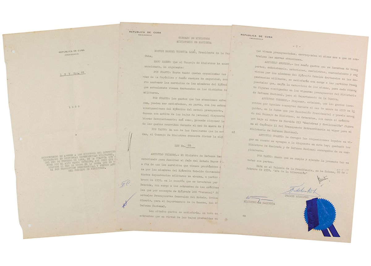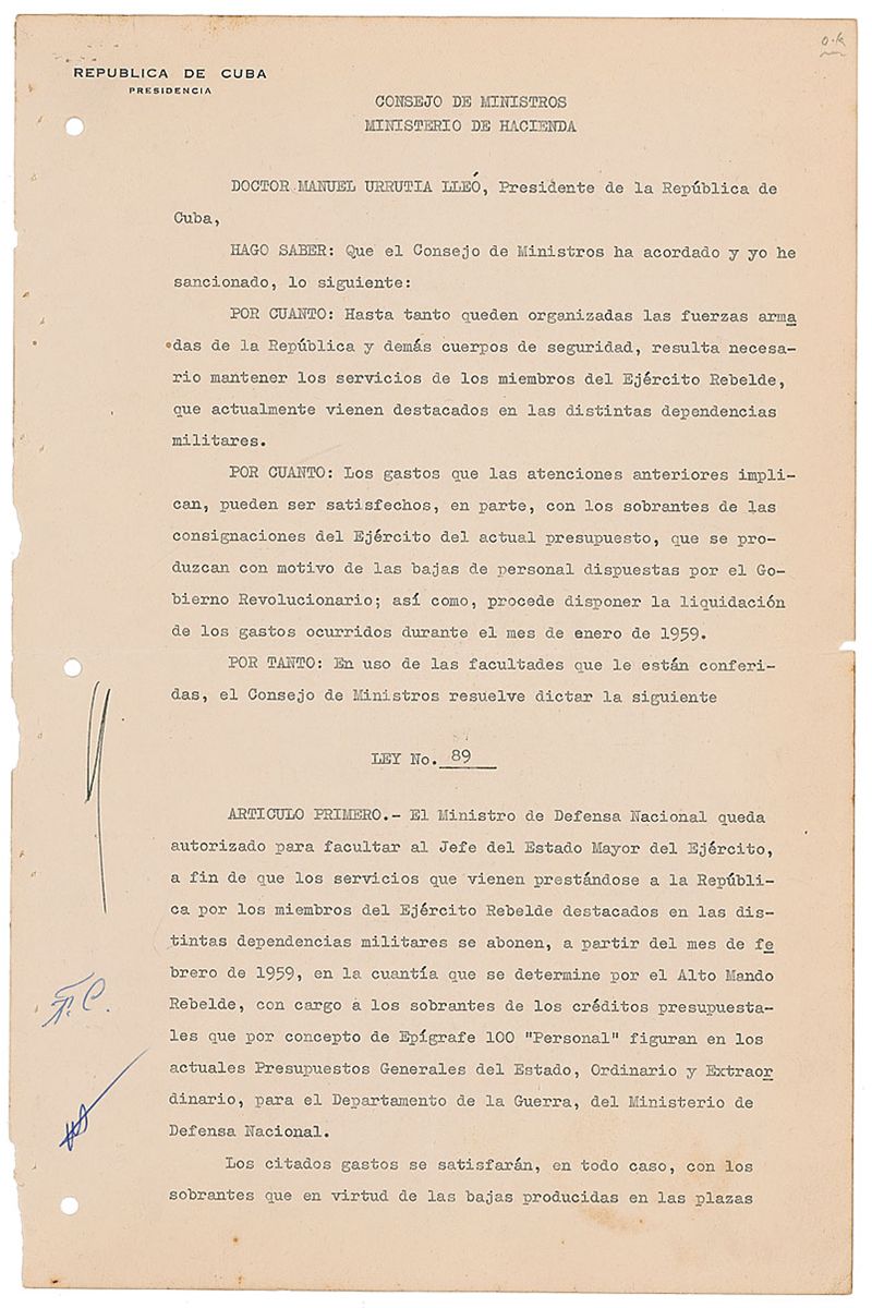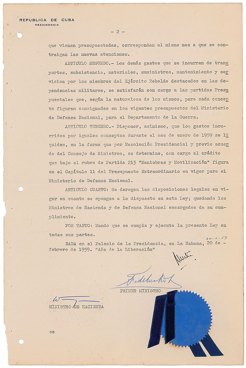 DS in Spanish, one page, 9 x 13.5, February 20, 1959. Document authorizing payments to members of the Rebel Army. In part (translated): “The Minister of Defense is authorized to empower the Chief of Staff of the Army to provide funds necessary to retain the services of the members of the Rebel Army…and to cover Rebel Army expenses such as transportation, subsistence, materials, supplies, and maintenance services.” Signed at the conclusion by Castro as prime minister and countersigned by Manuel Urrutia Lleo as president, and also initialed by both on the second page. The embossed blue Cuban presidential seal affixed below Castro’s signature remains crisp and intact, and retains its original ribbon. In fine condition, with expected document wear and binding holes to the left edge. Castro had assembled his Rebel Army in 1956 as part ofthe 26th of July Movement, and led them to overthrow the Cuban government in 1959. Dated just four days after Castro took office as prime minister, this is the earliest document from his administration that we have offered.