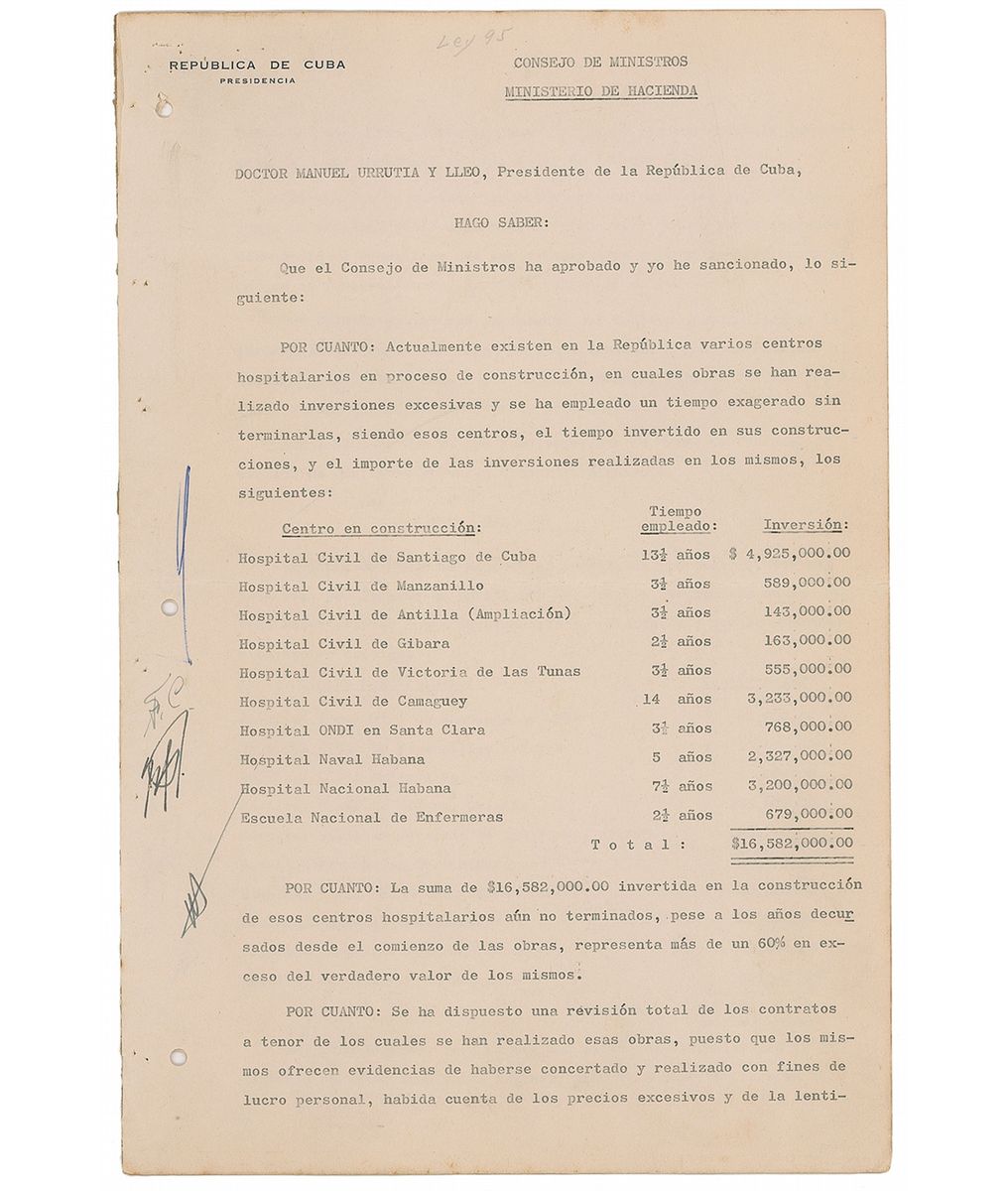 DS in Spanish, three pages, 9 x 13.5, February 23, 1959. Document regarding the finances of hospitals that are under construction. In part (translated): "There are now several hospital centers in the republic under construction, where excessive time has been invested at exaggerated costs and yet unfinished. Being those centers, the time invested in their buildings, and the amount of…$16,582,000.00 invested in the construction of these hospitals still unfinished, despite the years elapsed since the start of works, representing more than 60% in excess of their value…Notwithstanding the above, these are works of public and national usefulness which can not be achieved until the time the mentioned hospitals are operated upon completion of the works…It is of compelling interest to the revolutionary government the termination of public works started prior to the triumph of the revolution in order to serve the interest of the people to whom these works ultimately belong…Special credit is granted, only once, in the amount of $2,155,000.00 for the completion of the hospitals." Signed at the conclusion by Castro as prime minister and countersigned by Manuel Urrutia Lleo as president. Embossed blue seal affixed below Castro’s signature remains intact and retains its original ribbon. The first two pages are also initialed by Castro and Lleo. Binding holes and remnants to left edge, staple holes to upper left, and expected document wear, otherwise fine condition. Dated just seven days after Castro took office as prime minister, this is one of the earliest documents from his administration that we have offered.