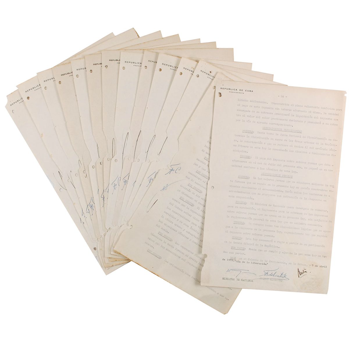 DS in Spanish, fourteen pages, 8.75 x 13.75, April 7, 1959. Lengthy document regarding property rights, government planning and zoning, and pricing regulation. In part (translated): “The Cuban state recognizes the existence and legitimacy of private property in its broad concept of social function, and consequently, the legislative body is to establish limitations on property rights demanded by the public need and social interest.” Signed at the conclusion by Castro as prime minister and by Manuel Urrutia Lleo as president, and countersigned by the minister of works; the document is also initialed on every page by all three parties. In very good condition, with binding holes and small areas of paper loss to left edge, various light toning and soiling, and the blue seal remaining partially attached to the reverse, with the original ribbon absent.