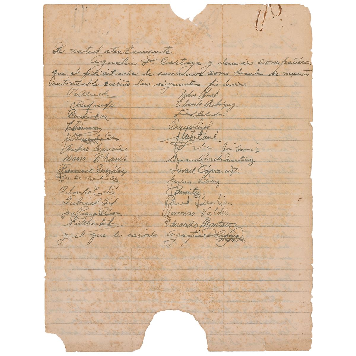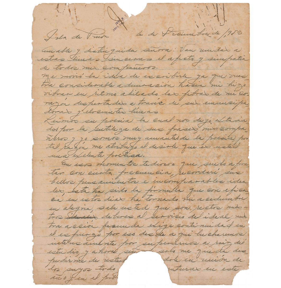 Manuscript DS in Spanish, written in the hand of fellow Moncada prisoner Agustin Cartaya, one lined page, both sides, dated December 6, 1953, written while on the Isla de la Juventud. In part (translated): "Together with these sincere lines are attached the affection and respect from all my partners. I was motivated with the idea of writing you because of your admiration towards myself that made the fibers of my heart vibrate with an accelerated rate that was motivated by your eloquent lines. We read your poem and it left us all inspired by the kindness of your phrases, my partners and I, are very lovers of the poetry, that is why I take the opportunity to tell you that you are an excellent poetry writer. In those difficult moments that I used to have with frequency I will remember your beautiful thoughts and incomparable ideals, this has been the formula that with effectiveness have changed during these days my sadness towards happiness. You know that our tasks are firm to serve the ideals, our formula of action demands continuity of our efforts that is why from here we will fight continually for our improving starting with the education and now lady I only have to say good bye wishing you together with all your family all…in this year and in the next.”