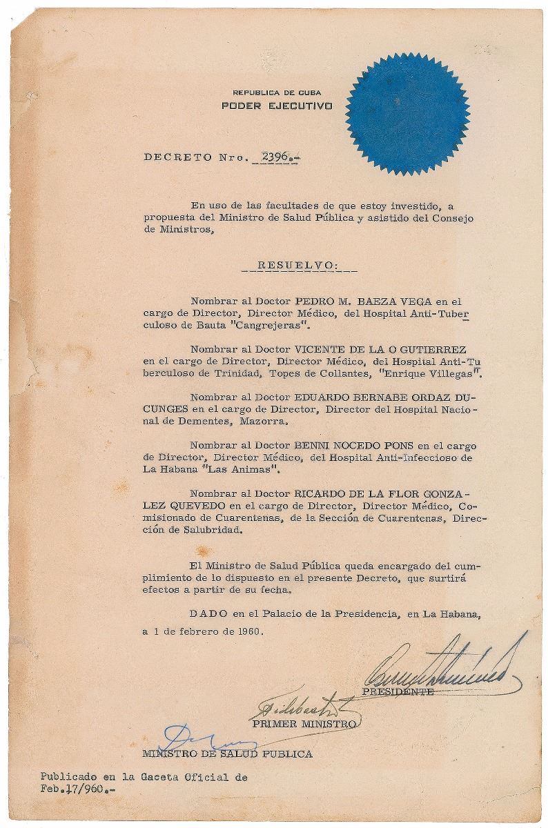 DS in Spanish, one page, 8.5 x 13, February 1, 1960. Untranslated document relating to the appointment of five doctors under the proposal of the Minister of Public Health and the assistance of the Council of Ministers, signed at the conclusion by Fidel Castro as prime minister, and Osvaldo Dorticos Torrado as president. Blue seal remains affixed to upper right. In very good condition, with areas of toning (heaviest along left edge), and small tears and edge paper loss repaired with tape on the reverse. Pre-certified PSA/DNA.