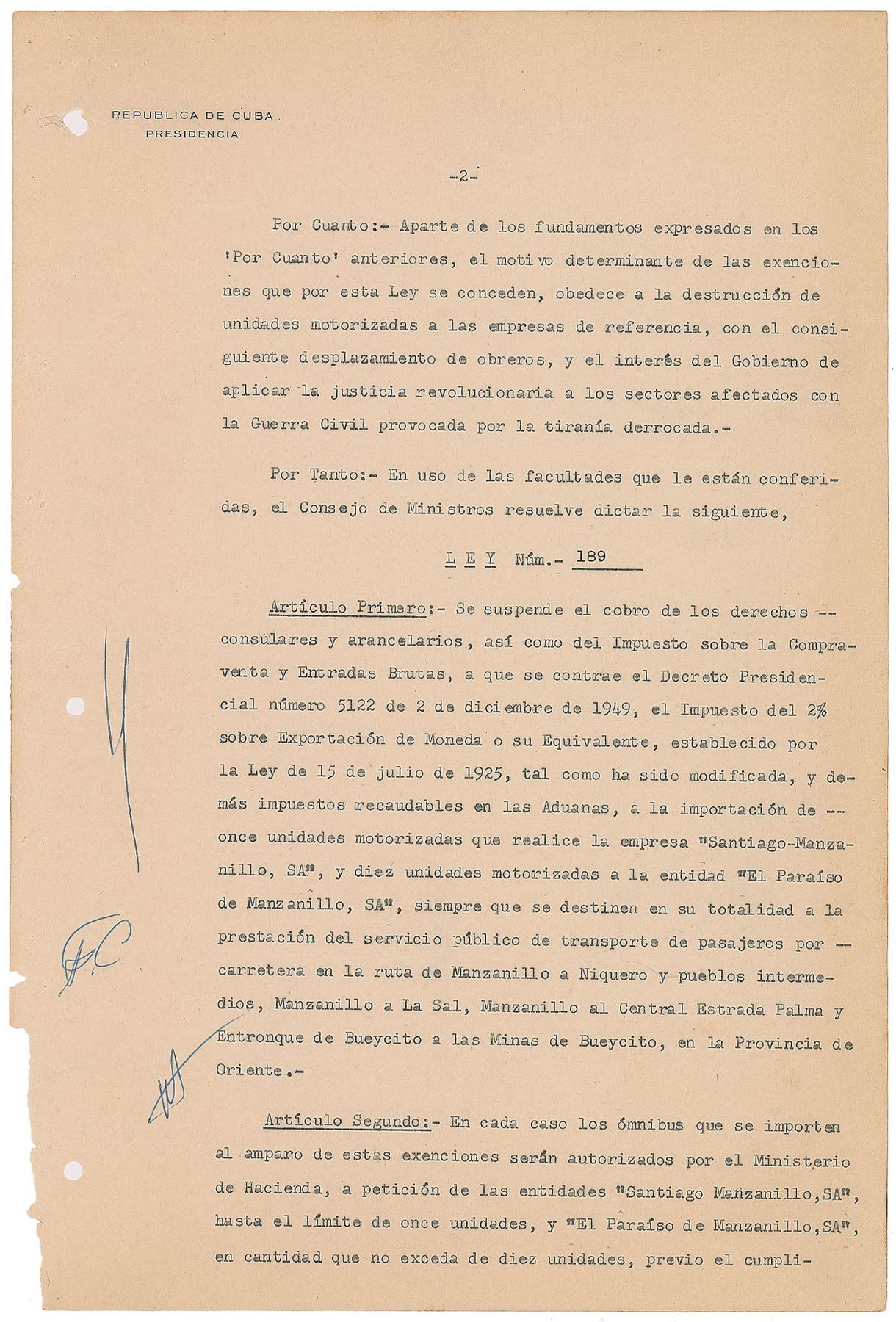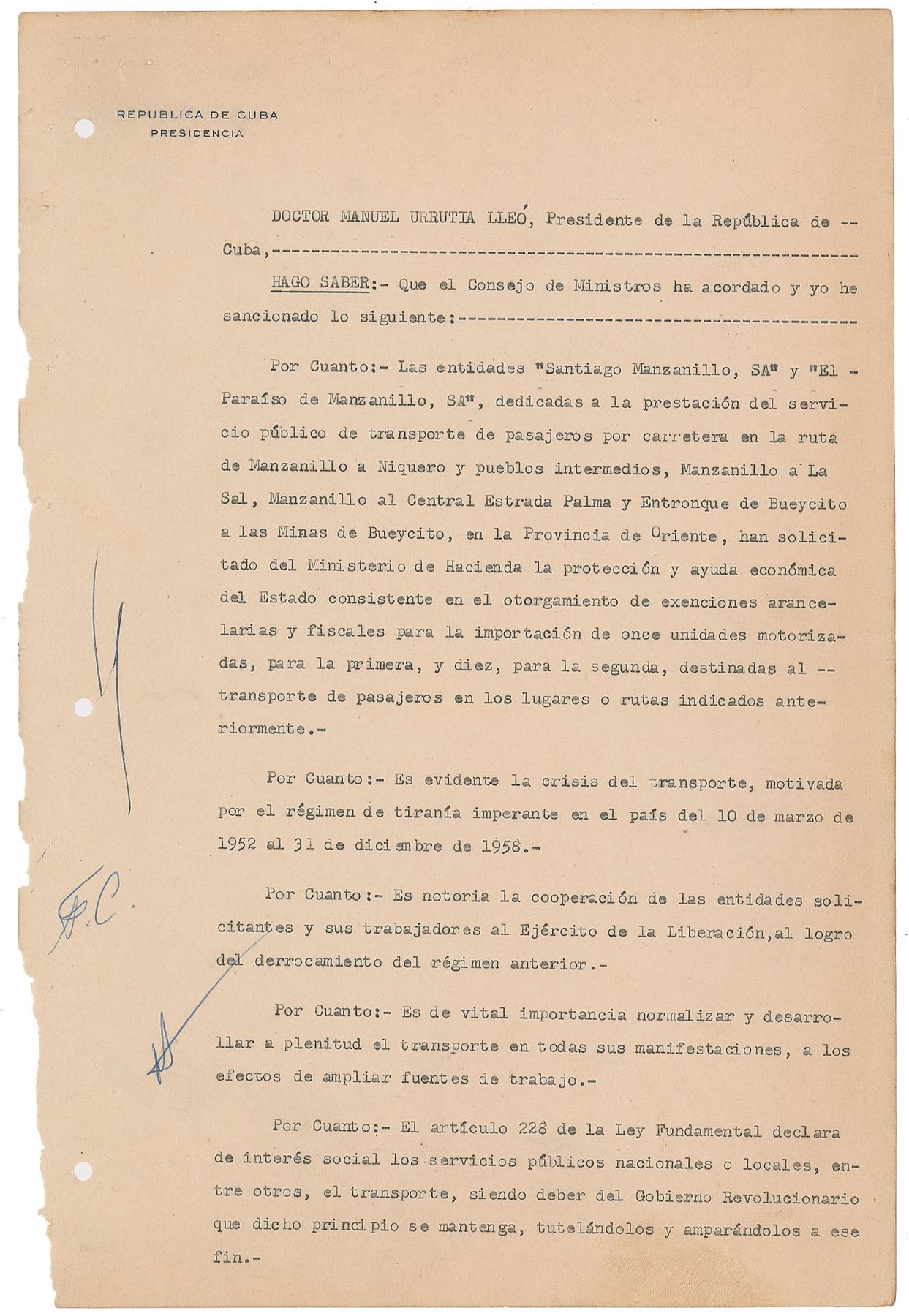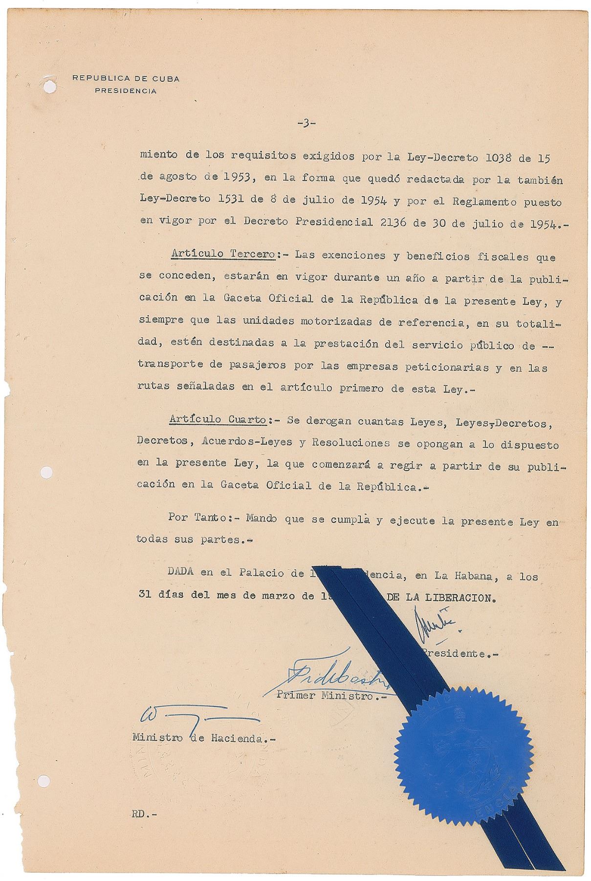 Early DS in Spanish, three pages, 8.5 x 13.25, March 31, 1959. In part (roughly translated): "I hereby announce that the Council of Ministers has agreed and I have sanctioned the following:—The entities 'Santiago Manzanillo, SA' and 'El Paraiso de Manzanillo, SA', engaged in the provision of public transportation services road passengers on the route from Manzanillo to Niquero and intermediate villages, Manzanillo to La Sal, Manzanillo to Central Estrada Palma and Entronque de Bueycito to the Mines of Bueycito, in Oriente Province, have requested from the Ministry of Finance the protection and assistance Economic status of the State consisting in the granting of tariff and tax exemptions for the importation of eleven motorized units for the first, and ten, for the second, for the transportation of passengers at the places or routes indicated above." Signed at the conclusion by Fidel Castro as prime minister, and Manuel Urrutia Lleo as president, both of whom initial the preceding two pages. Blue seal and ribbon remain affixed to lower right. In very good to fine condition, with staple and binding holes, and trimming to the left edge.