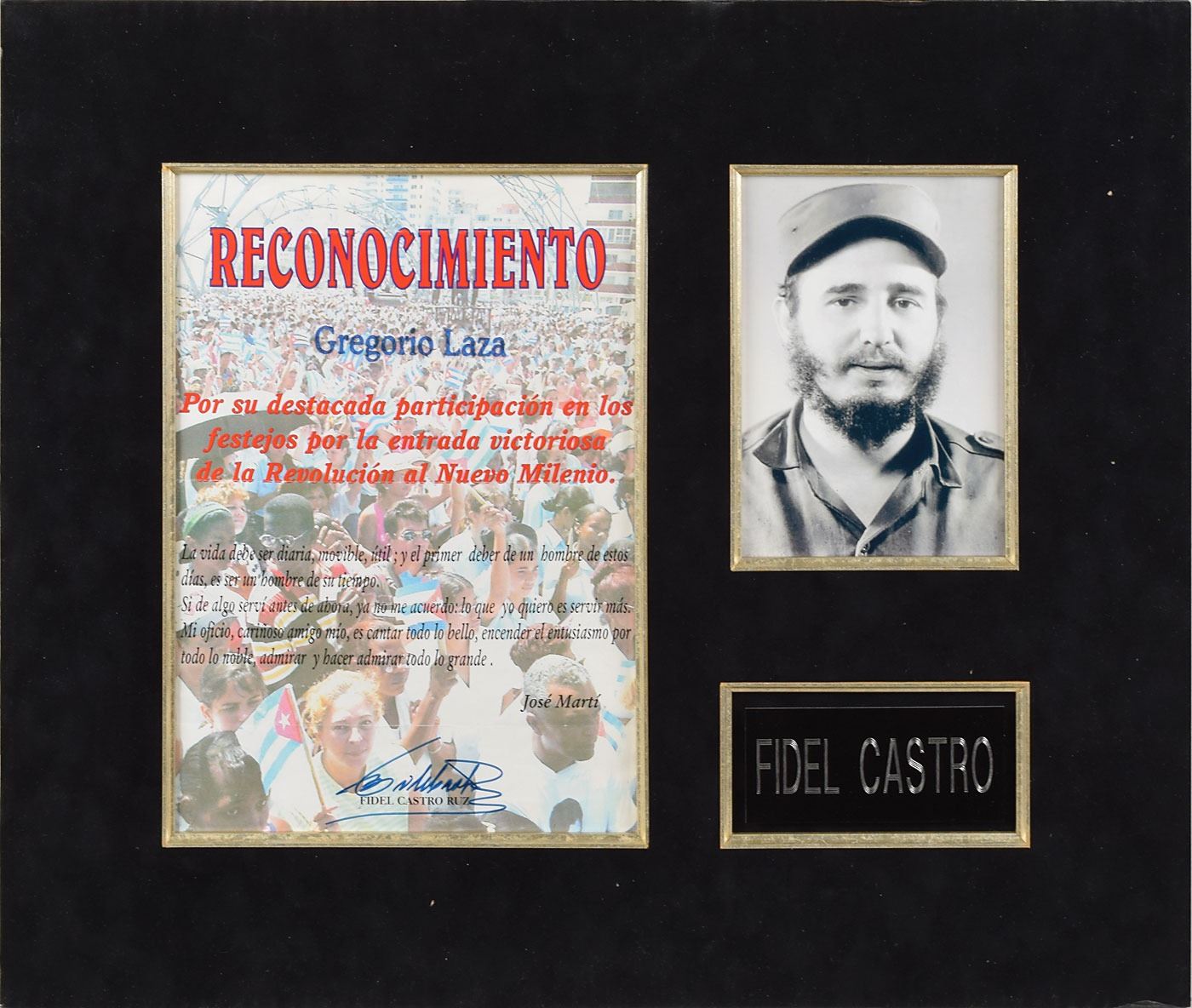 Colorful certificate of merit issued to Gregorio Laza by the Cuban government, 8 x 11.5, signed at the bottom in blue felt tip by Castro. Suede-matted with a plaque and portrait to an overall size of 20.75 x 17.5. Several horizontal creases (none affecting the Castro signature) and light overall wrinkling, otherwise fine condition. These certificates were issued to commemorate the 42nd anniversary of the Cuban Revolution and also in celebration of the new millennium. Castro signed some of these documents and gave them to Cuban sports and arts personalities.