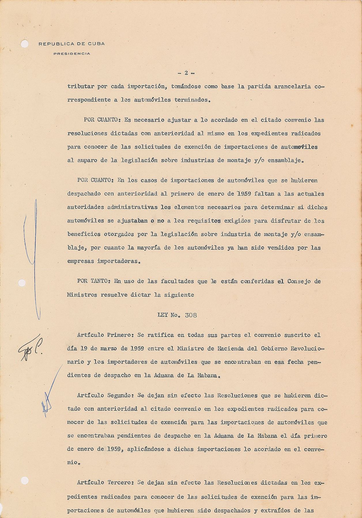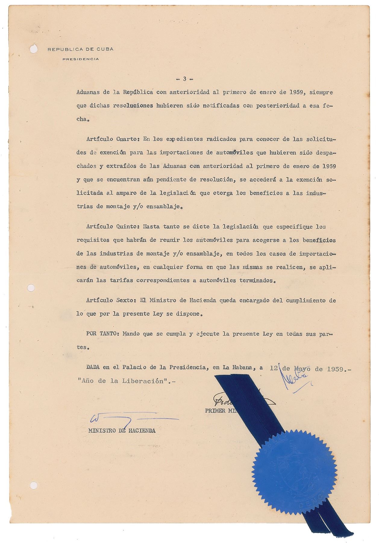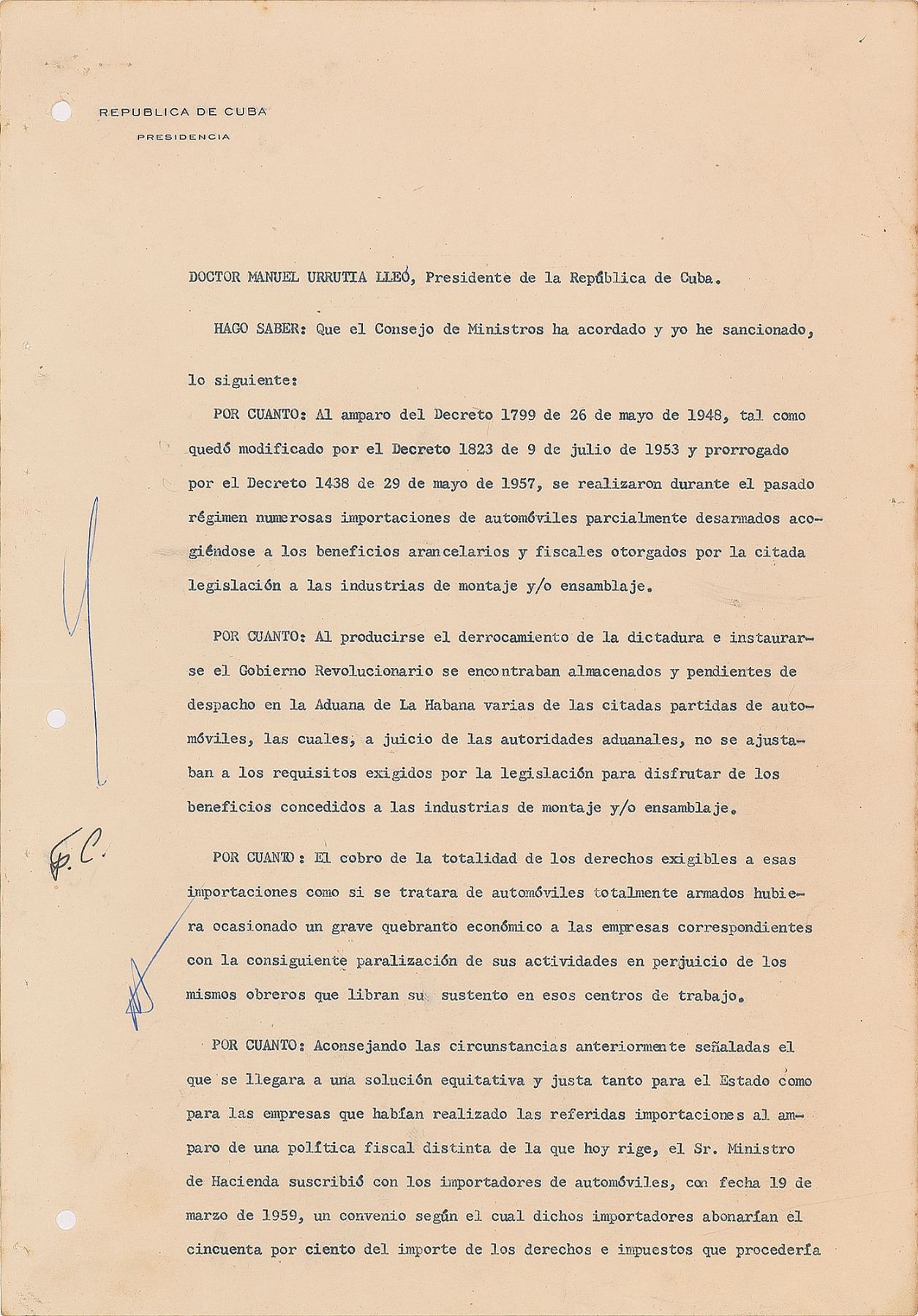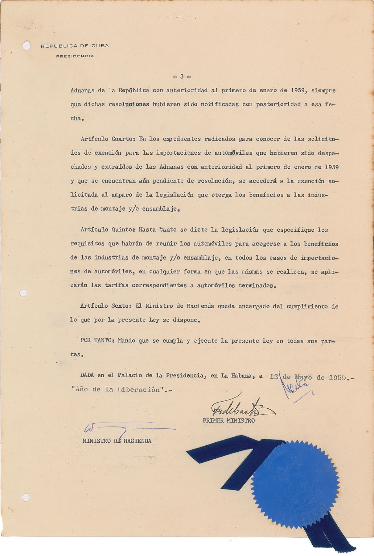 DS, in Spanish, three pages, 9 x 13, May 12, 1959. Official decree relating to adjusted tariffs and tax benefits for imported automobile parts made during the past regime, in part (roughly translated): "Several of those games cars, which, according to the customs authorities, did not fit the requirements of the legislation to enjoy the benefits granted to the assembly industries…the collection of all the charges payable by such imports as if they were fully armed cars have caused a serious economic calamity in the respective companies with subsequent paralyzation of its activities to the detriment of the workers themselves to fight their livelihood working in these centers…the Minister of Finance signed with importers…March 1959, an agreement according to which the importers pay fifty percent of the amount of duties and taxes would proceed taxed on each import, taking as a basis the tariff heading the cars finished…In the case of imports of cars that were declared for release before the first of January 1959 to the current lack necessary administrative authorities to determine if these cars are adjusted or not the requirements to enjoy the benefits granted by the legislation on industrial assembly…because most of the cars have already been sold by the importers." Signed at the conclusion in black ink by Castro, who also adds his initials to the first two pages. Last page retains the original blue stamp and ribbon. In fine condition, with binding, filing, and staple holes to the left edge.