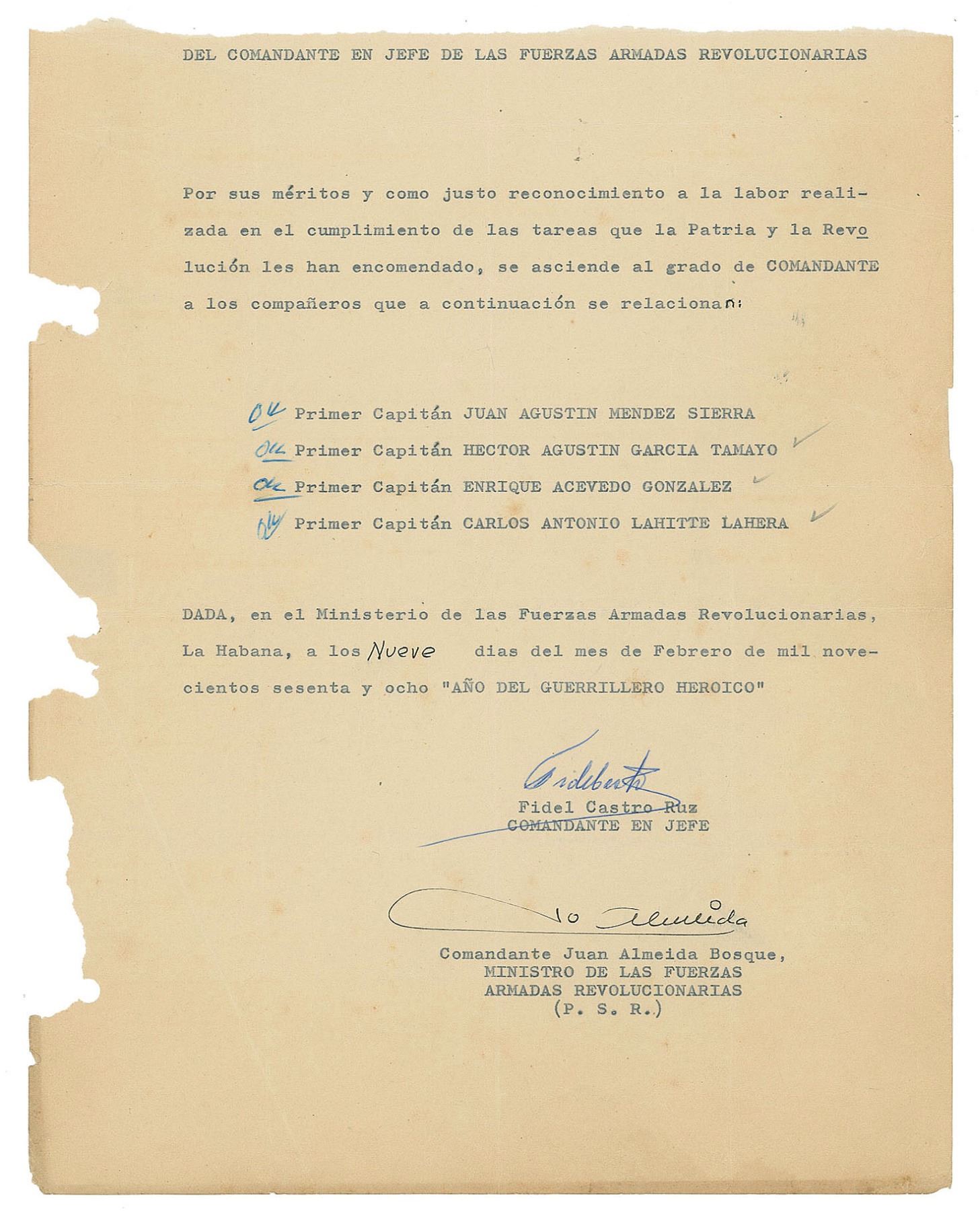 Desirable DS in Spanish, one page, 8.5 x 10.75, February 9, 1968. Official decree from "the Commander-in-Chief of the Revolutionary Armed Forces," in part (translated): "Due to their merits and as a fair recognition of the work done in the fulfillment of the tasks entrusted to them by the Homeland and the Revolution, the companions promoted to the rank of Commander are listed below: First Captain Juan Agustin Mendez Sierra / First Captain Hector Agustin Garcia Tamayo / First Captain Enrique Acevedo Gonzalez / First Captain Carlos Antonio Lahitte Lahera." Signed at the conclusion in blue ballpoint by Castro, and countersigned in black ink by Juan Almeida Bosque. In very good condition, with creasing, short edge tears, and paper loss to the top and the left side.