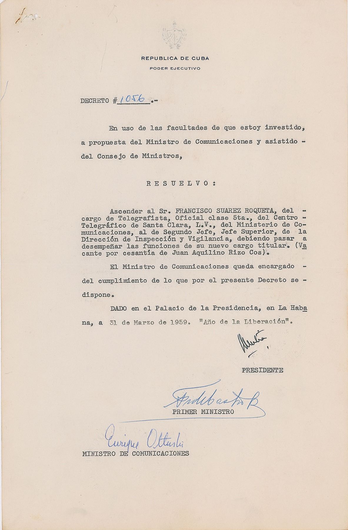 DS in Spanish, one page, 8.5 x 13, March 31, 1959. Official order issued by Castro as prime minister of Cuba, in part (translated): "I resolve: To ascend Mr. Francisco Suarez Roqueta, of the position of Telegraphist, 5th Class Officer, of the Telegraph Center of Santa Clara, LV, of the Ministry of Communications, of the Second Chief, Senior Chief, of the Directorate of Inspection and Surveillance, and must pass to perform the functions of his new title.” Signed at the conclusion in ink by Prime Minister Fidel Castro, President Manuel Urrutia Lleó, and Minister of Communications Enrique Oltuski. In fine condition, with staple holes to the upper left corner.