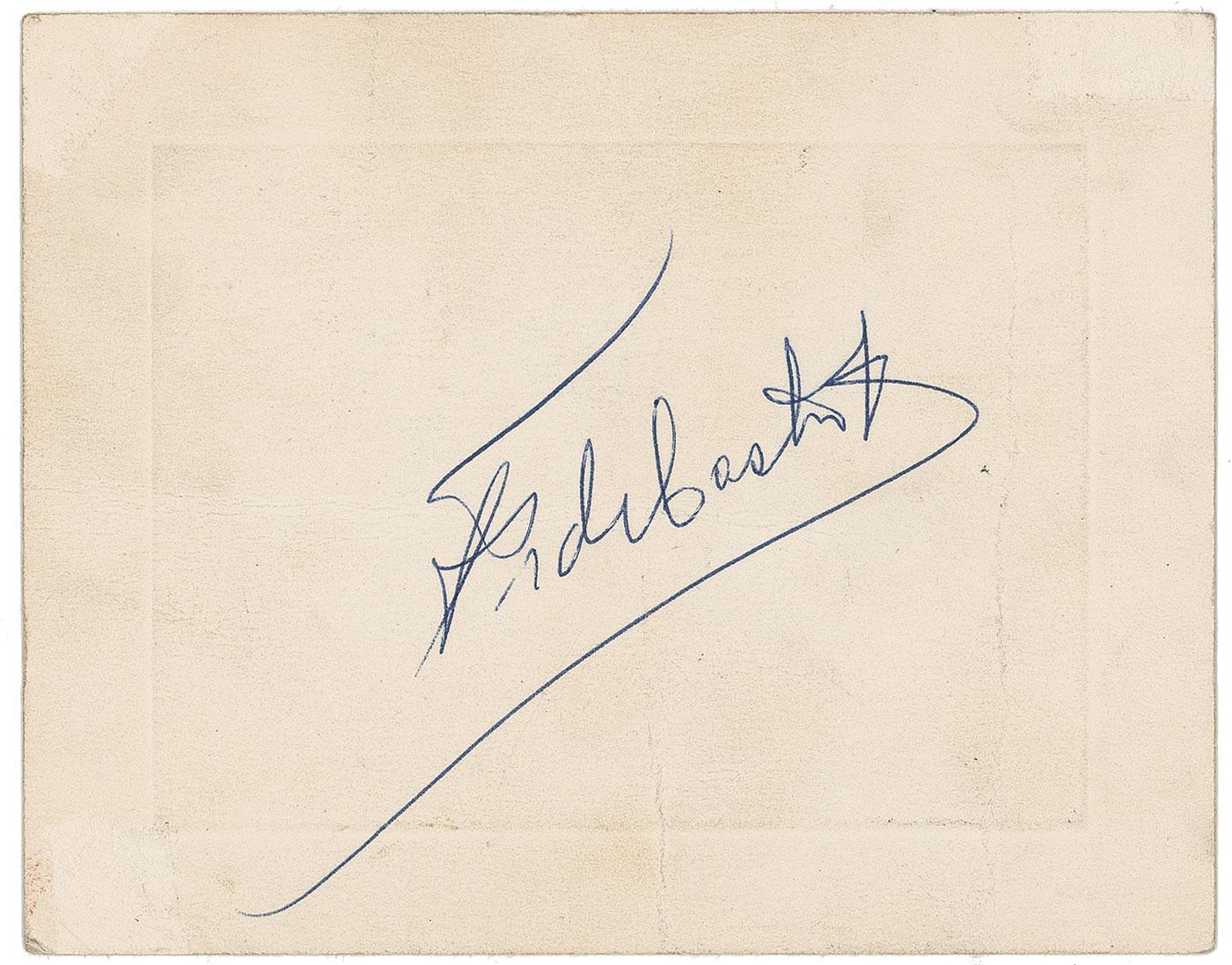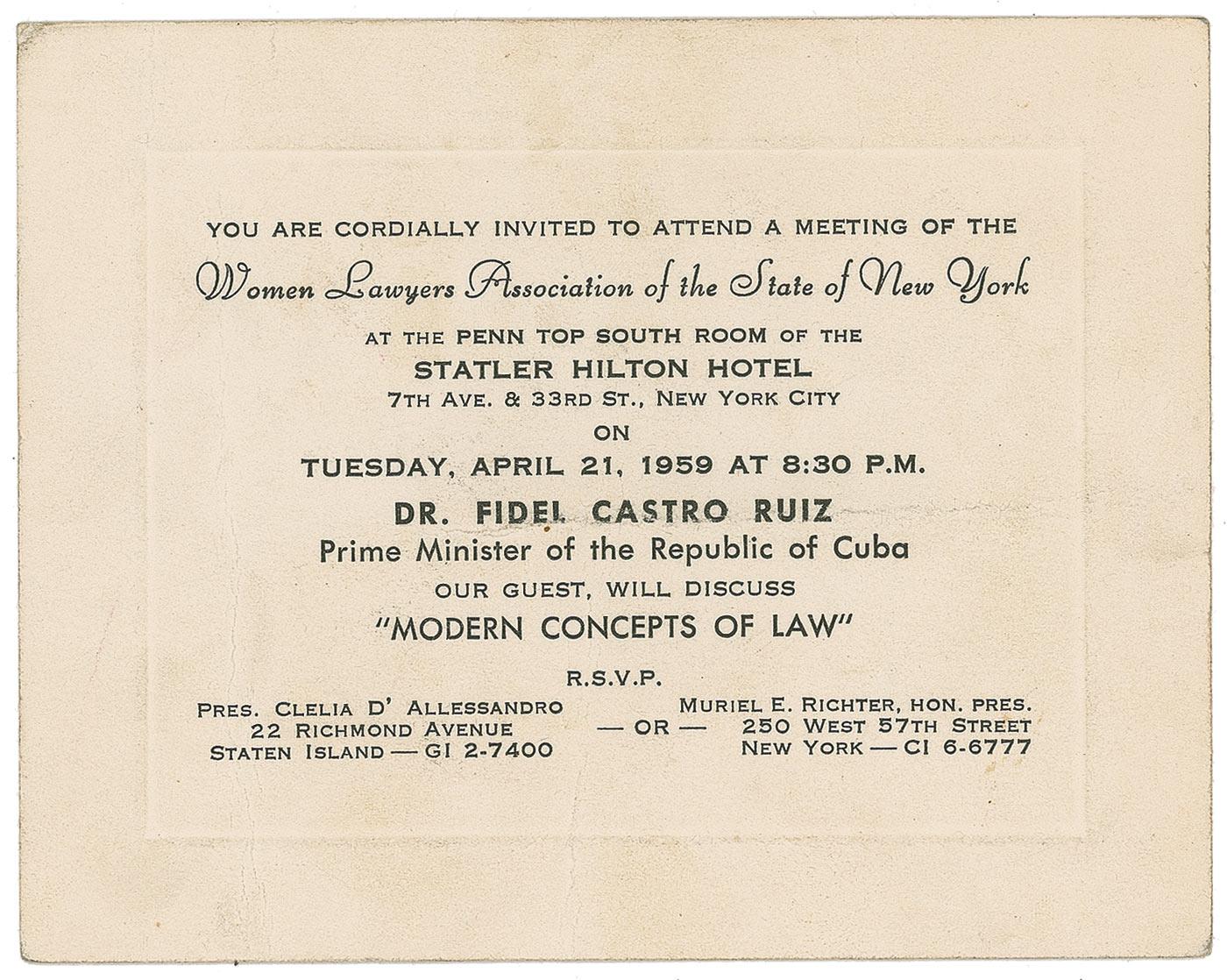 Original invitation, 5 x 4, for a meeting of the Women Lawyers Association of the State of New York on Tuesday, April 21, 1959, at the Statler Hilton Hotel. Invitation goes on to say “Dr. Fidel Castro Ruiz, Prime Minister of the Republic of Cuba, our guest will discuss ‘Modern Concepts of Law.’” Signed on the reverse in blue ballpoint by Castro. Some scattered light surface creases, a bit of mild toning and soiling, and trivial surface loss to top right corner of reverse, otherwise fine condition.