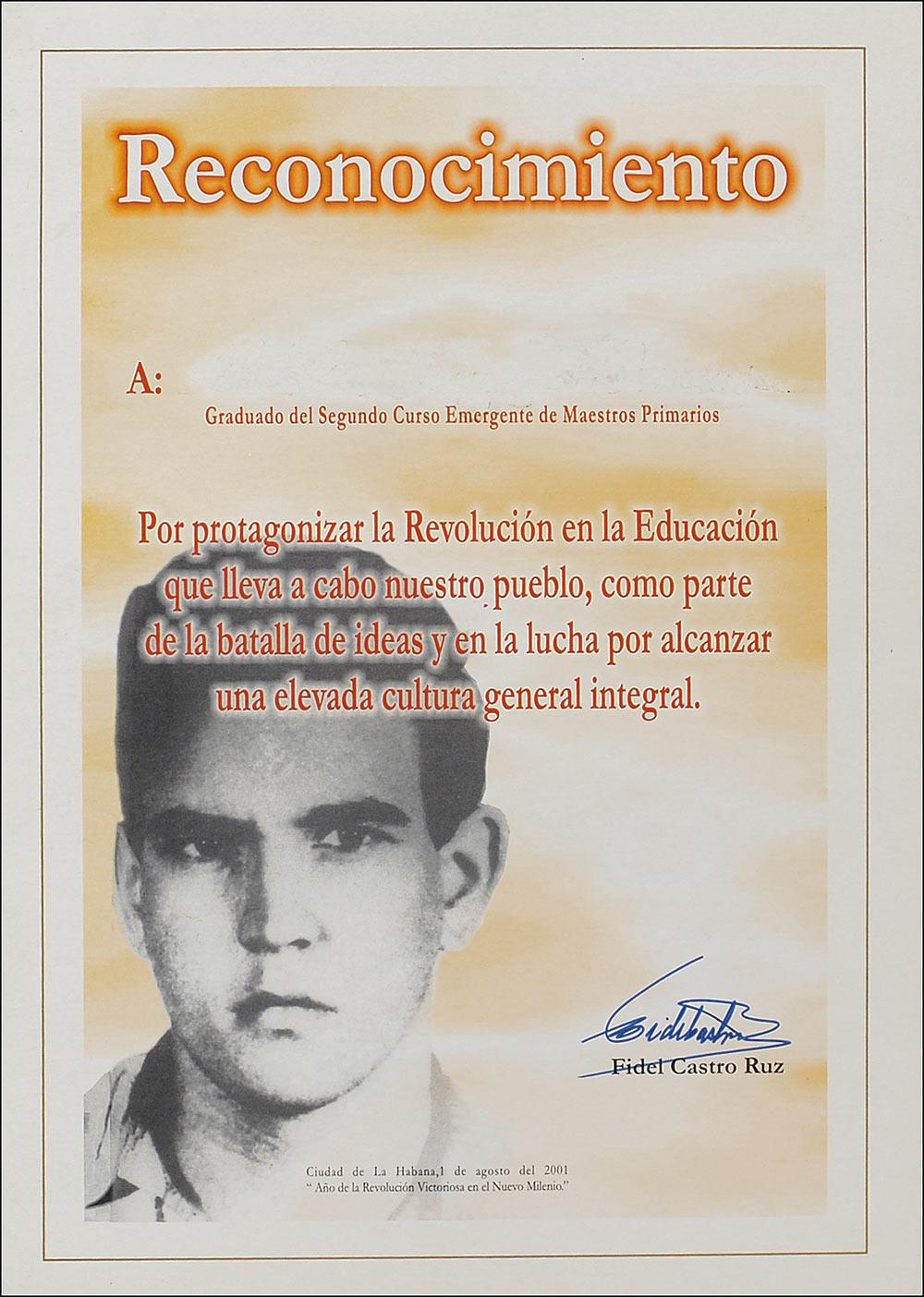 DS, one page, 11.75 x 16.5, August 1, 2001. A poster-style certificate “por protagonizar la Revolución en la Educación.” In very good condition, with original recipient’s name erased and scattered mild soiling and rippling. The signature is bold and unaffected.