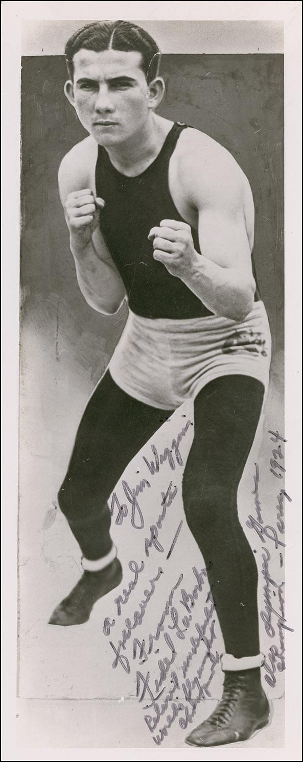 Boxer and sports writer who won the world flyweight championship in 1927. Glossy 4 x 10 full-length photo, signed and inscribed in black felt tip “To Jim Wiggins, a real sports follower – From Fidel LaBarba, retired undefeated worlds flyweight champion, also Olympic Games champion – Paris 1924.” In fine condition, with creases to center of image.