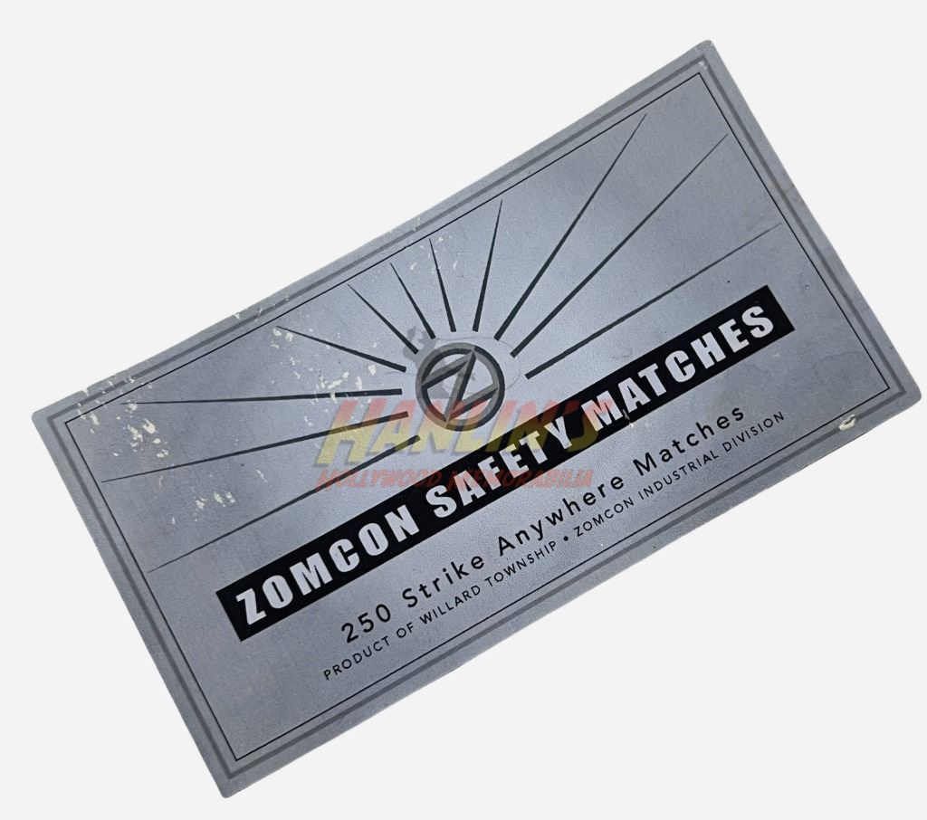 Original box label for Zomcon safety matches used in the zombie comedy production of 'Fido' (2006), where space radiation turns the dead into Zombies. Zomcon fights zombies and finds ways to pacify and use them. On pre-teen Timmy's (Kesun Loder's) 1950s suburban street, they all have a zombie doing menial chores. Timmy's zombie becomes his pet and friend, and is named Fido (Sir Billy Connolly).