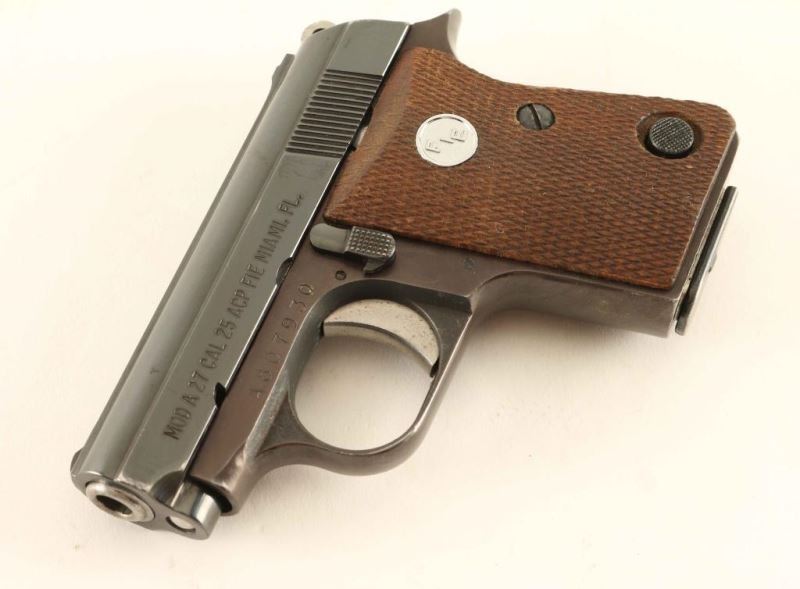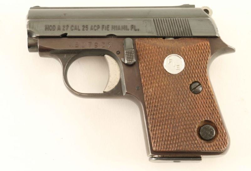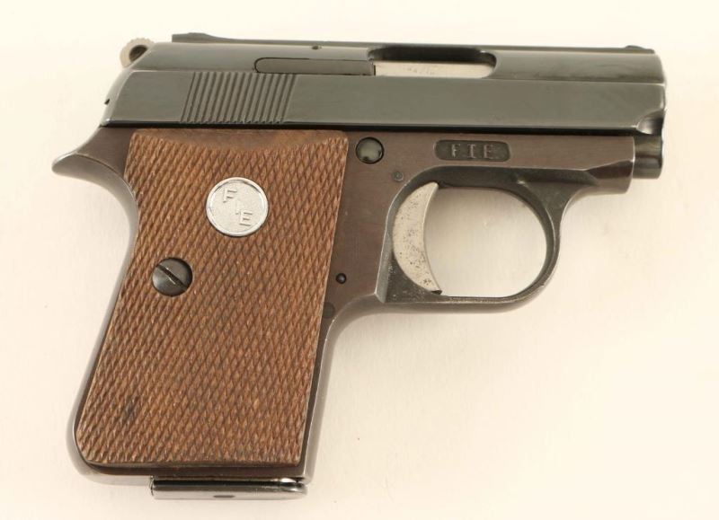 Single action semi-automatic copy of the Colt Junior, chambered in .25 Auto and assembled in the US with Italian made parts. Features a blue finish, 2.25" barrel, fixed sights, smooth trigger, serrated round hammer spur, manual safety/slide stop, magazine disconnect safety, push button magazine release, 7 round magazine, and two-piece checkered wood grips with silver FIE medallions. Pistol retains approximately 80% of it's original finish with the slide showing scattered handling marks and the frame turned plum. Action is smooth, bore is pristine and wood grips are very good with semi-worn points. Condition is NRA Good to Very Good. ***Modern Firearm***
