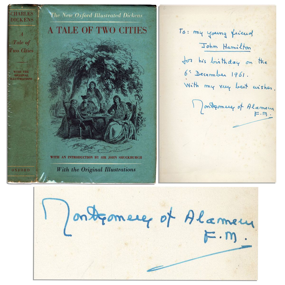 Field Marshal Bernard Montgomery signs this copy of ''A Tale of Two Cities'' by Charles Dickens for a young friend, John Hamilton. The famous General writes, ''To: my young friend / John Hamilton / for his birthday on the 6th december 1961. With my very best wishes. Montgomery of Alamein / F.M.'' on the front free endpaper. The edition runs 358pp. and is published by Oxford University Press: London: 1960. Book, measuring, 7.5'' x 5'' is in very good condition. An unusually signed item by Montgomery.