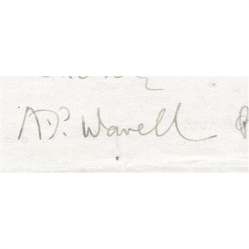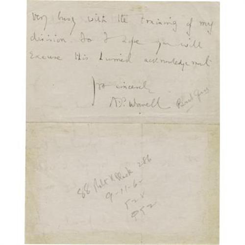 <B>Field Marshal Sir Archibald Wavell Autograph Letter Signed</B></I> “<I>A. P. Wavell</B></I>”. Two pages, 5.5” x 7”, Sussex, August 13, 1936, to Mrs. Alec Tweedie. Wavell writes to author Mrs. Alec Tweedie: “<I>Thank you so much for your letter and for the copy of Lord Allenby's letter, very typical of him. It will be a very big job to write his life. He was such a big man in every way. I am in camp at present, and very busy with the training of my division. So I hope you will excuse this hurried acknowledgement.</B></I>” Tweedie was obviously preparing to write a book on Allenby and knowing that Wavell had served under Allenby in WWI was seeking his input. With the usual fold creases, else very good. <I>Ex. Henry E. Luhrs Collection.</B></I> <BR><BR><b>Shipping:</b> Flat Material, Small (<a target="_blank" href="http://www.heritageauctions.com/common/shipping.php">view shipping information</a>)