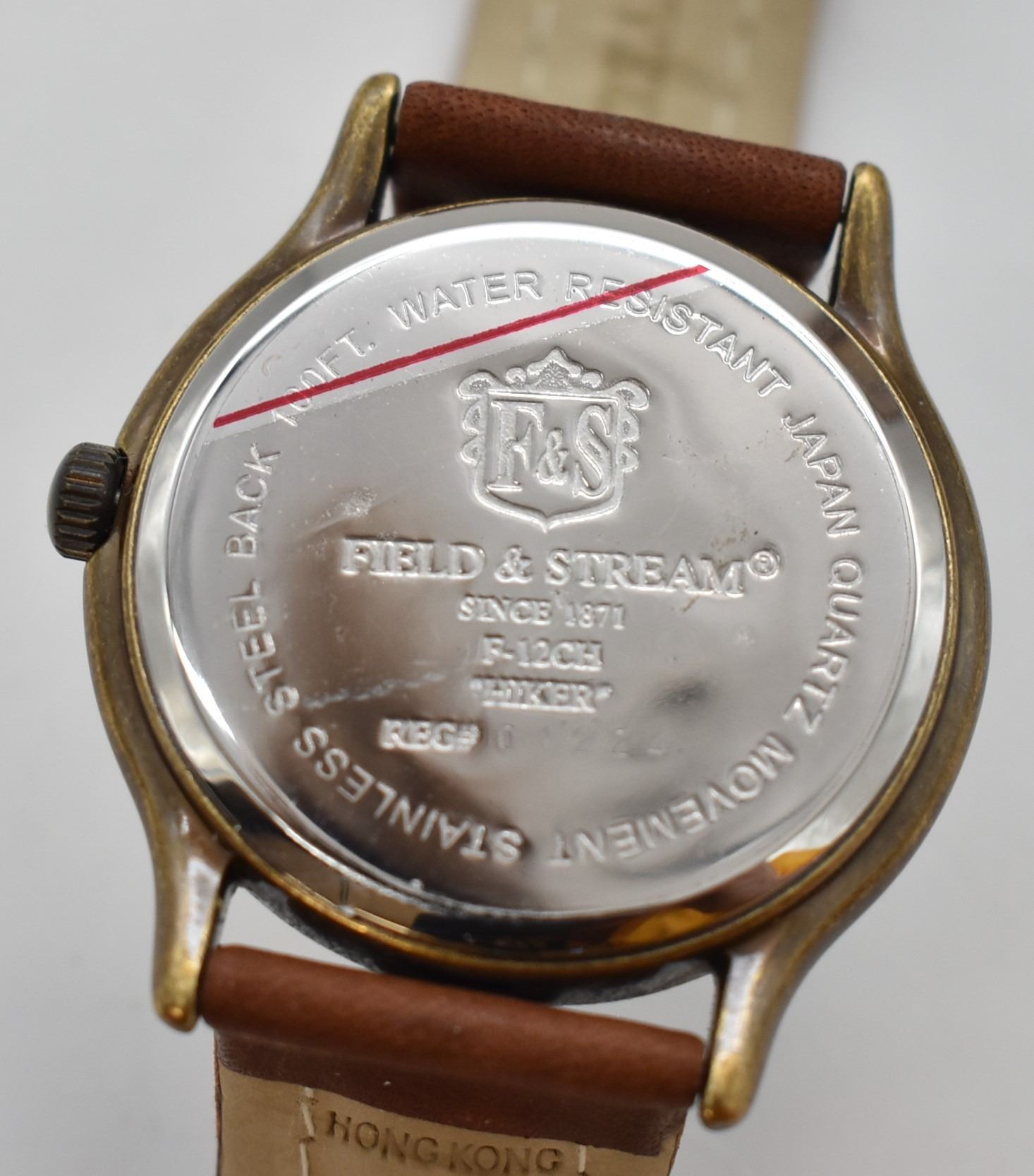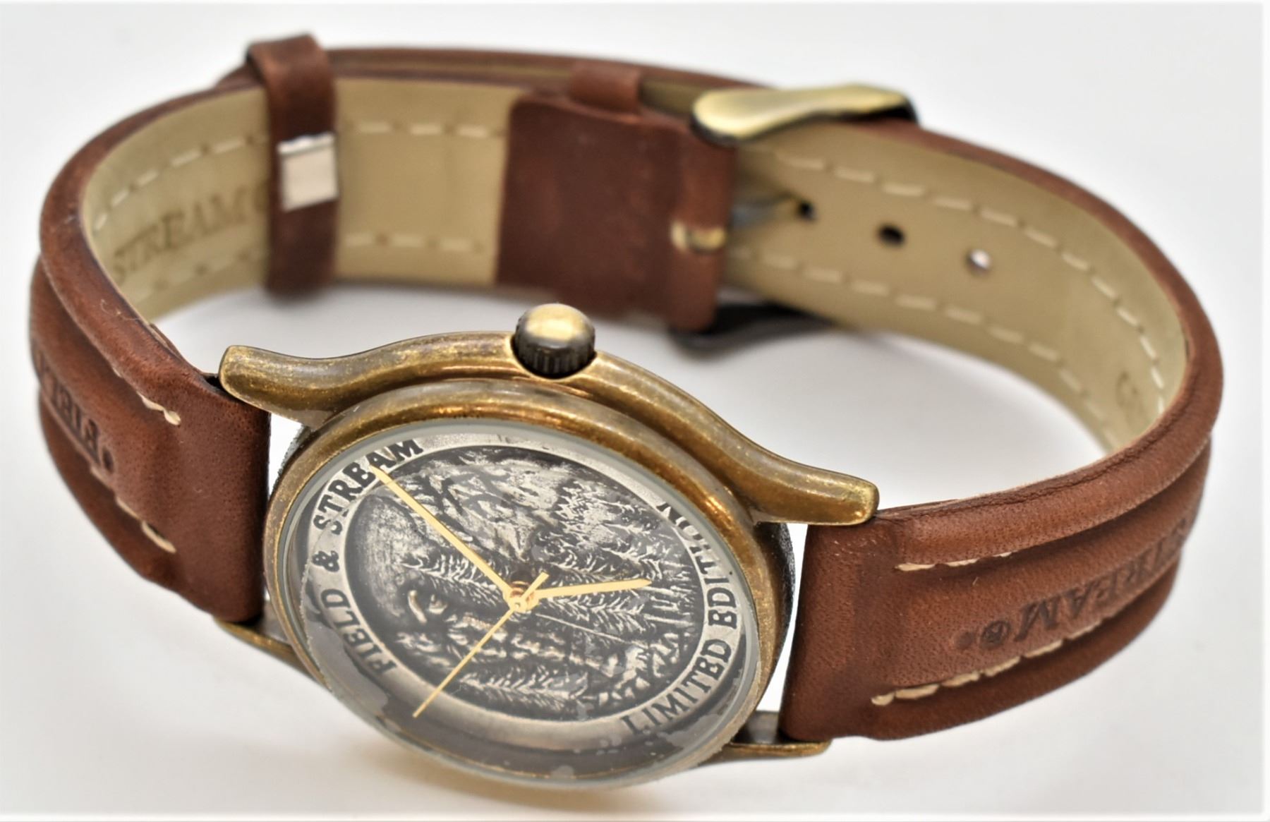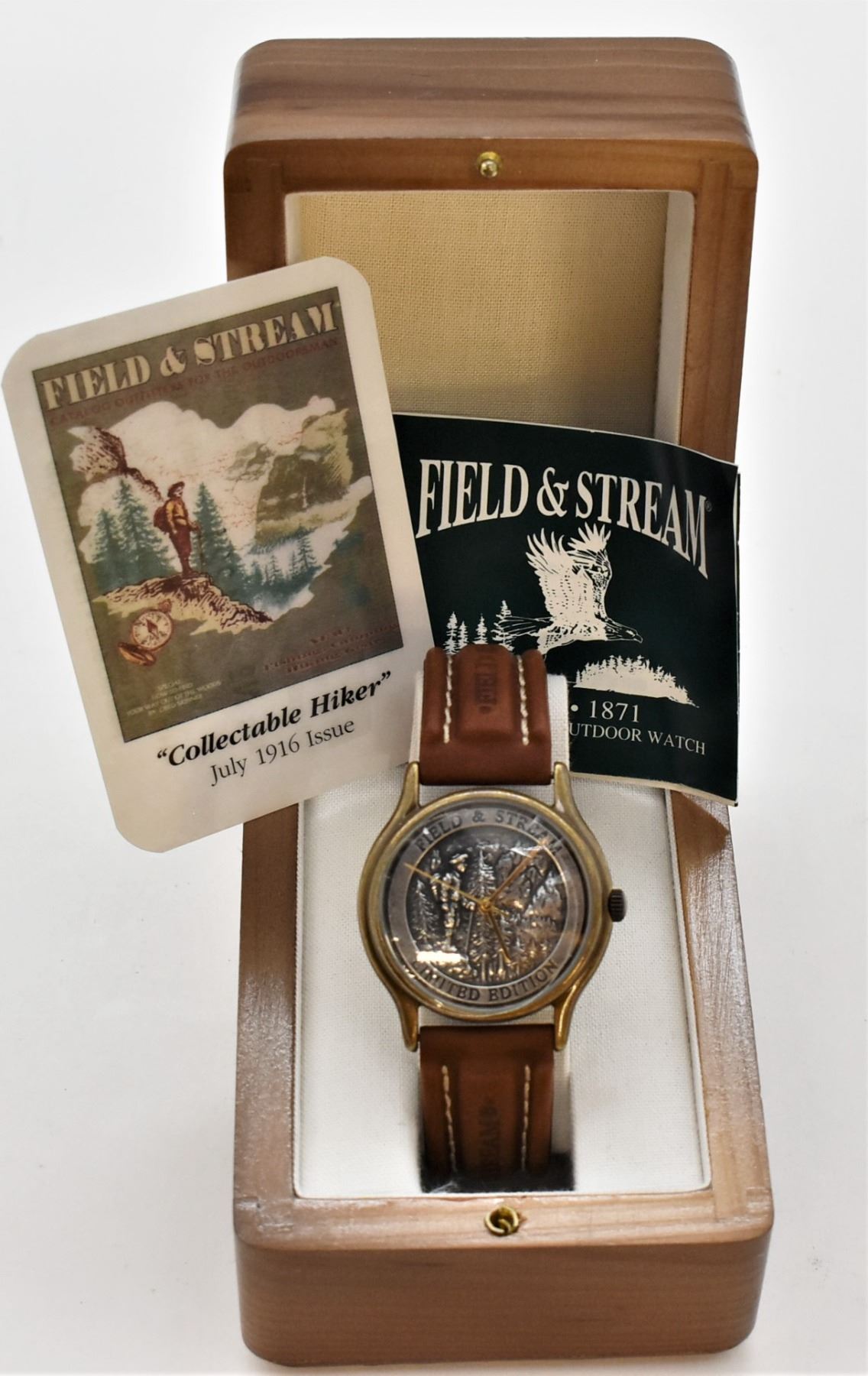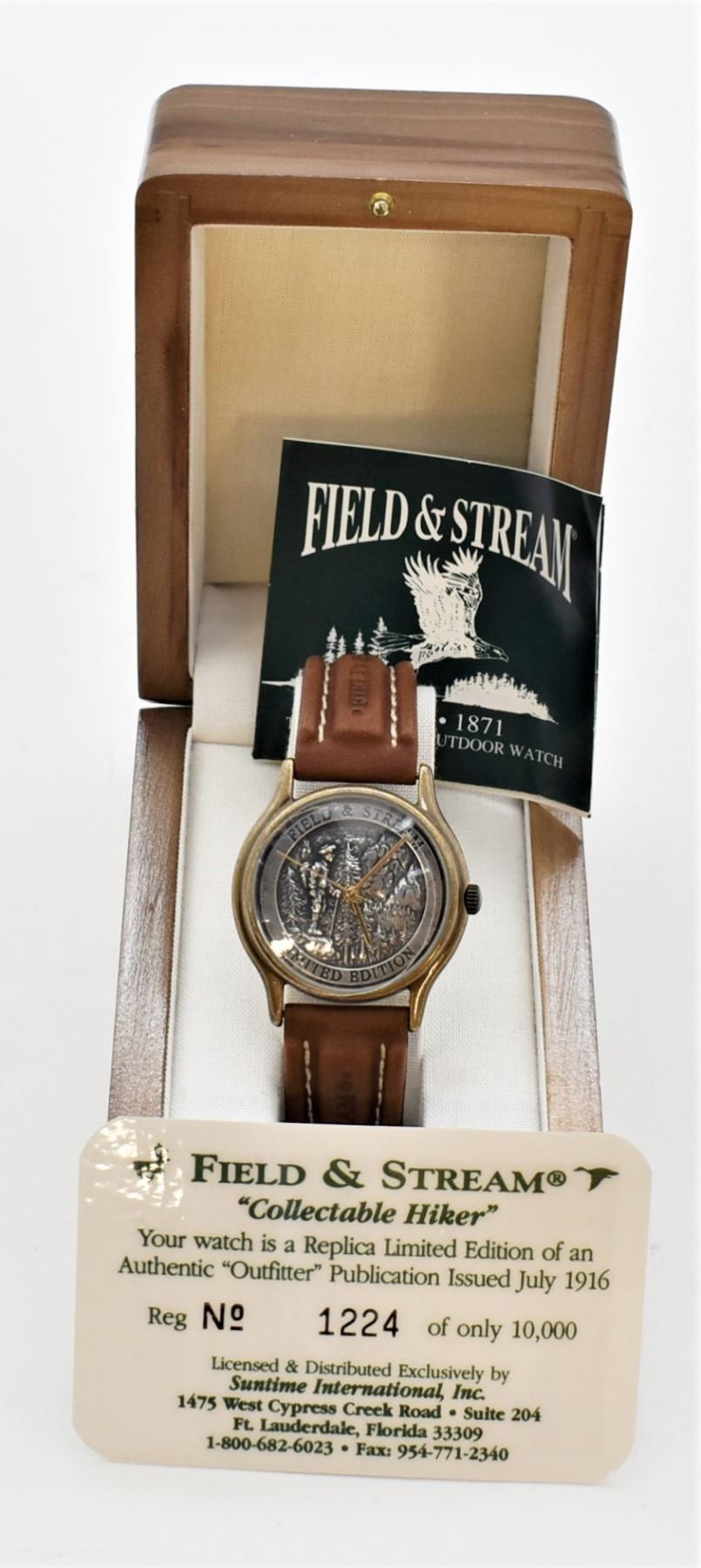 Field & Stream Ltd. Ed. Wrist Watch #1224/10,000 comes with COA, this is a replica of an Authentic ''Outfitter'' Publication Issued July 1916, leather band and comes in original wood box, watch face measures 1.5'' x 1.5'', watch band is adjustable