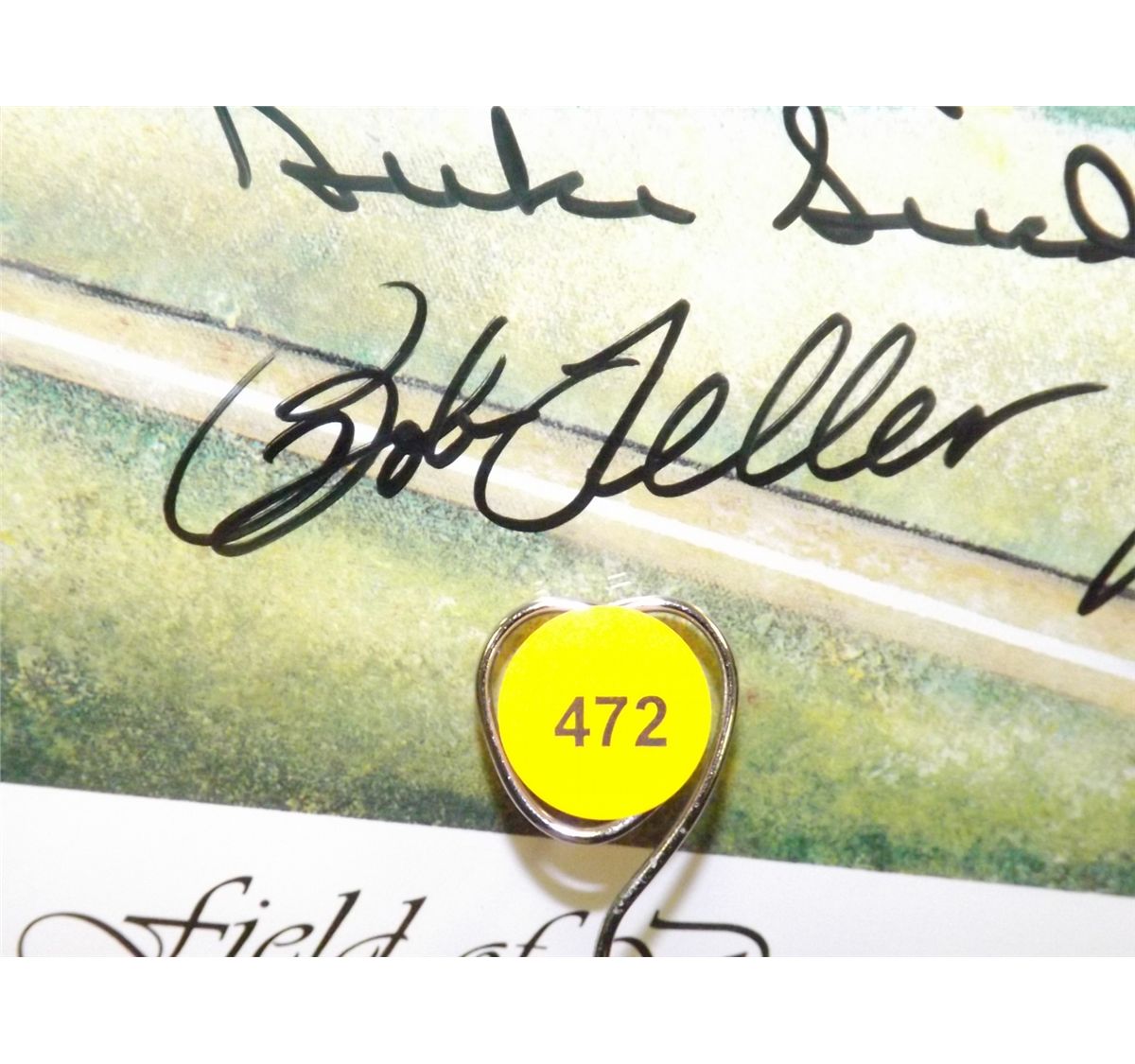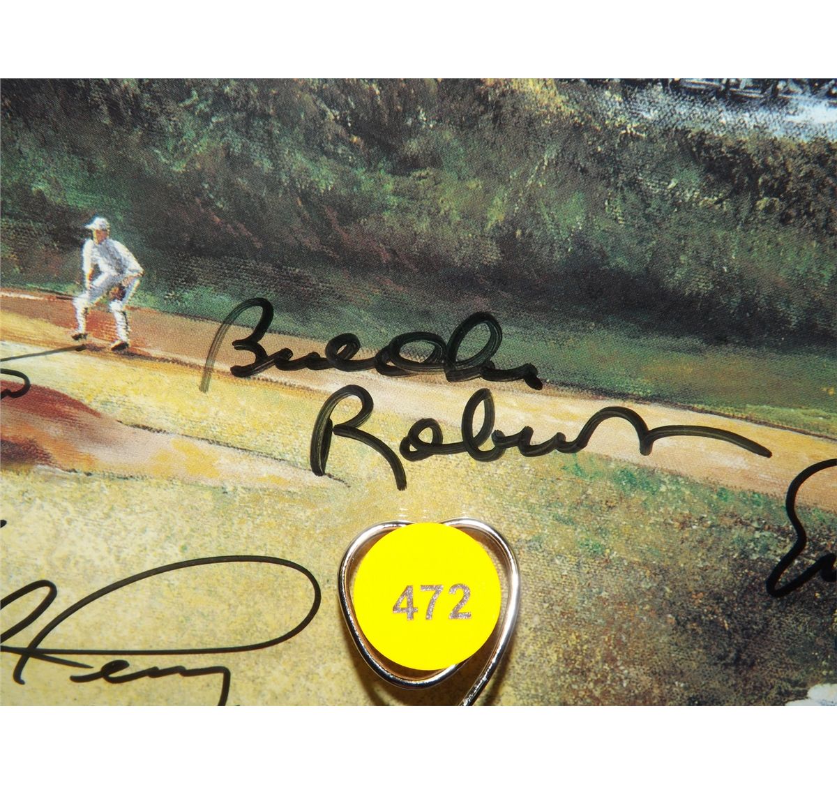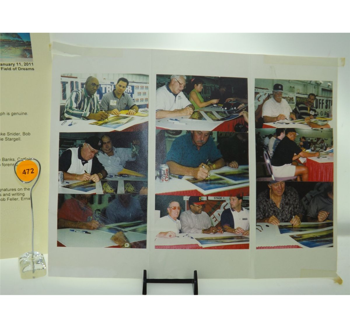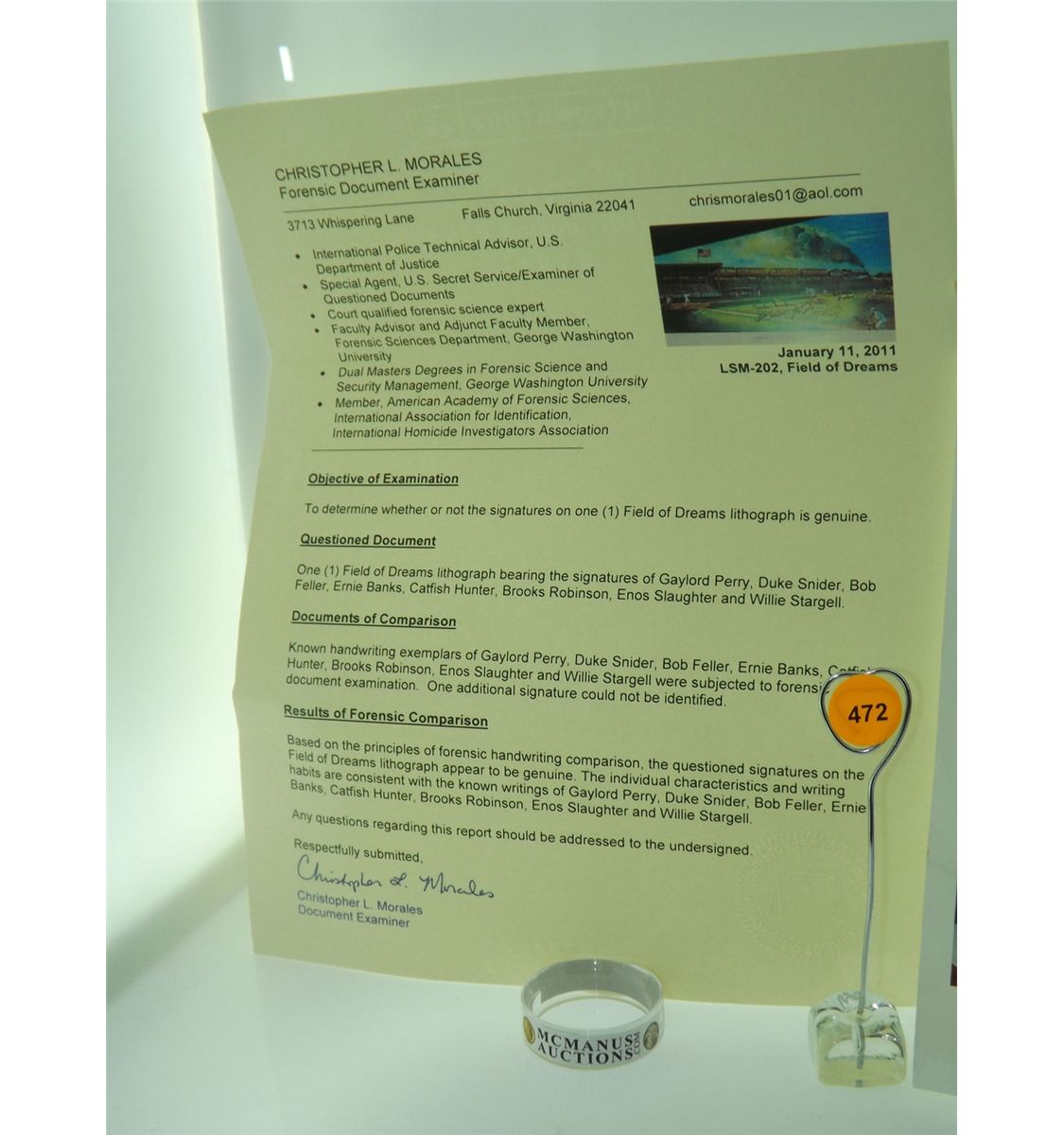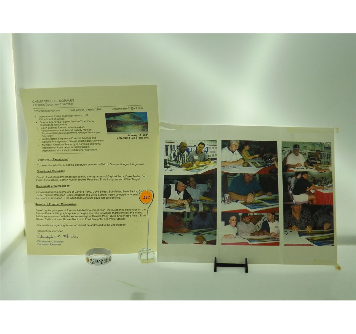 Field of Dreams Autographed Poster. Framed Color Lithograph Signed by: Gaylord Perry,Duke Snider, Bob Feller, Catfish Hunter, Ernie Banks, Brooks Robinson, Enos Slaughter and Willie Stargell. Additional Signature Could Not Be Identified. Includes Photos of Players Signing Lithograph. Appraised or estimated retail value $2800. COA by Christopher Morales. All Sales Final. Please see terms and conditions of auction.