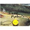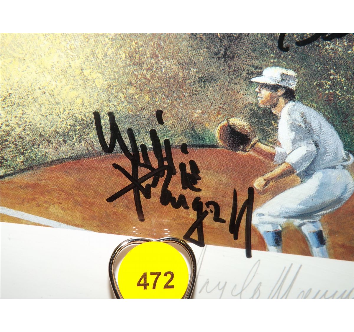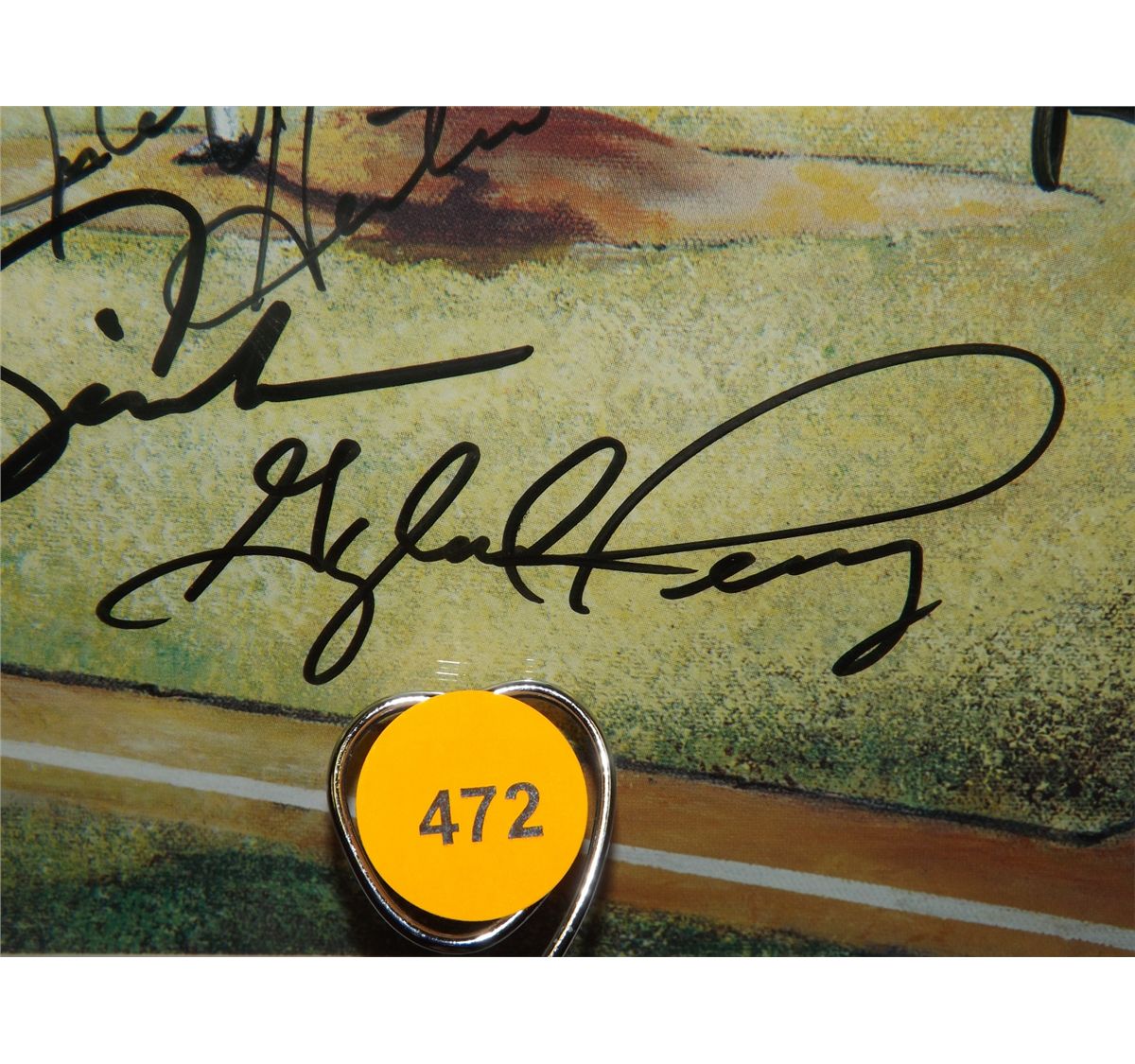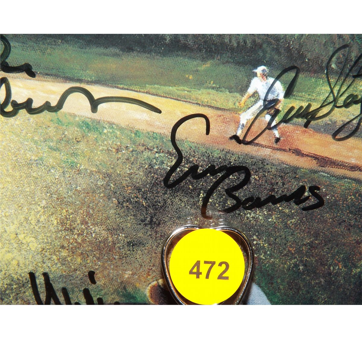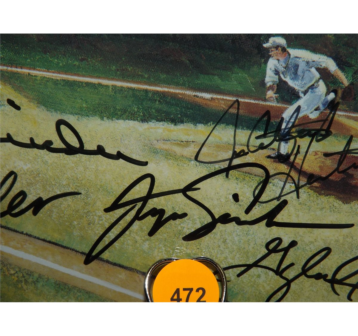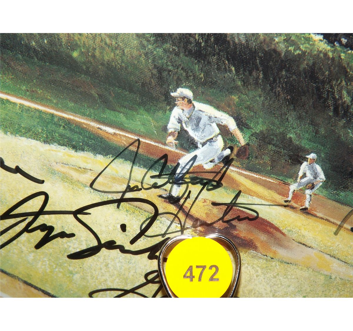 Field of Dreams Autographed Poster. Framed Color Lithograph Signed by: Gaylord Perry,Duke Snider, Bob Feller, Catfish Hunter, Ernie Banks, Brooks Robinson, Enos Slaughter and Willie Stargell. Additional Signature Could Not Be Identified. Includes Photos of Players Signing Lithograph. Appraised or estimated retail value $2800. COA by Christopher Morales. All Sales Final. Please see terms and conditions of auction.