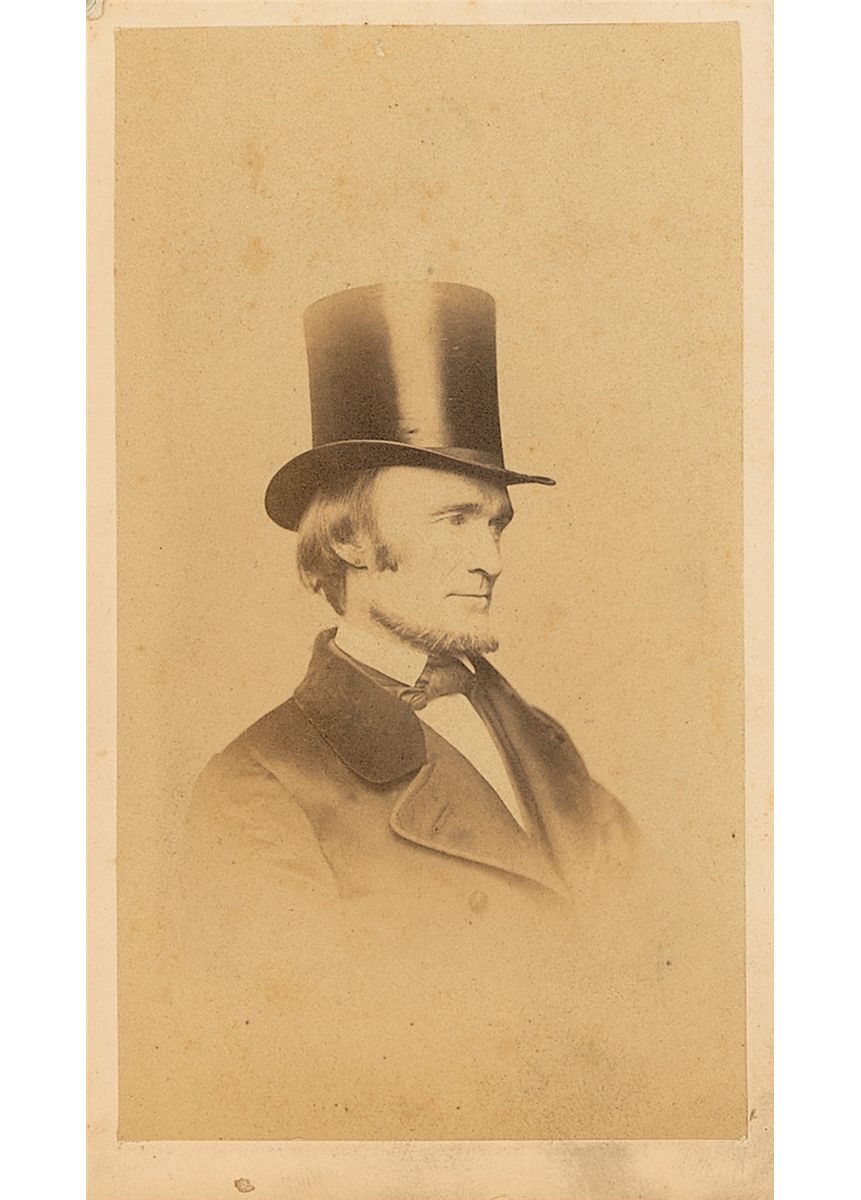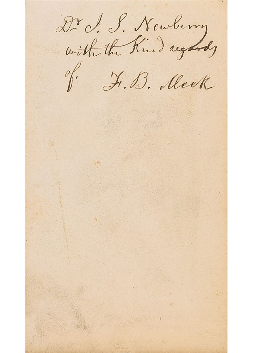 American geologist and paleontologist (1817–1876). Original 2.5 x 4.25 carte-de-visite bust portrait by an anonymous studio, signed and inscribed on the reverse to a fellow geologist in black ink, “Dr. J. S. Newberry, with the kind regards of F. B. Meek.” Scattered foxing and soiling to the image, and some soiling to the reverse, otherwise fine condition.