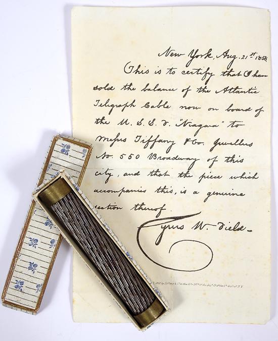 [Fields, Cyrus]. Souvenir section of the first trans-Atlantic telegraph cable from 1858, 4 x ¾ in. Banded in brass at both ends, where the core structure can be seen. Accompanied by a facsimile document signed by Field and datelined New York, Aug. 21st 1858. It states, "This is to certify that I have sold the balance of the Atlantic Telegraph Cable now on board of the U.S.S.F. 'Niagara' to Messrs. Tiffany & Co. Jewellers No. 550 Broadway of this city, and that the piece which accompanies this, is a genuine section thereof."