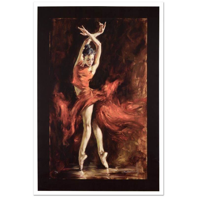 "Fiery Dance" is a limited edition hand embellished giclee on stretched canvas by Andrew Atroshenko, numbered and hand signed by the artist! Measures approx. 24" x 40" (image).