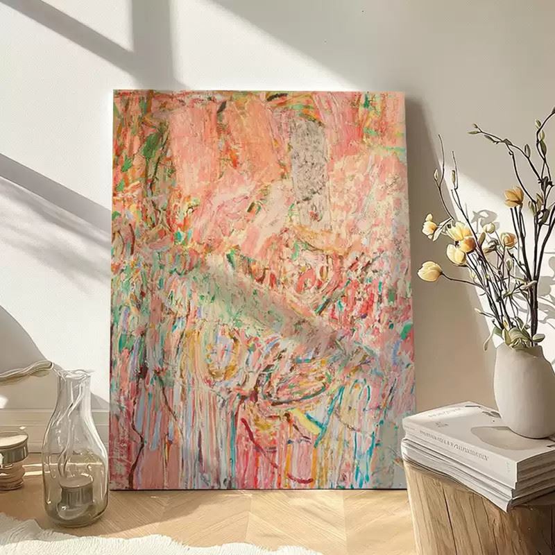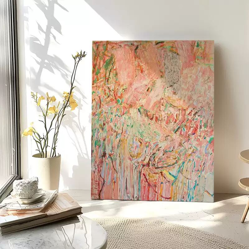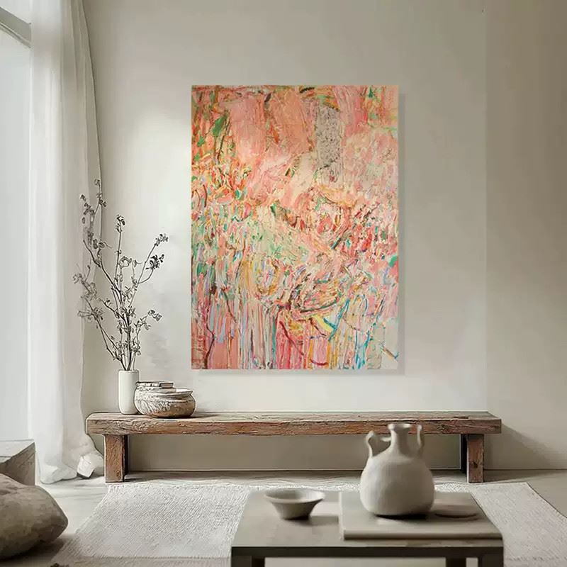 This artwork uses bold color blocks and brushstrokes to depict the clash of heat and passion. The soft pink tones combined with strong lines create an abstract scene full of emotional tension and dynamism. Dimensions: 24 x 31 inches.