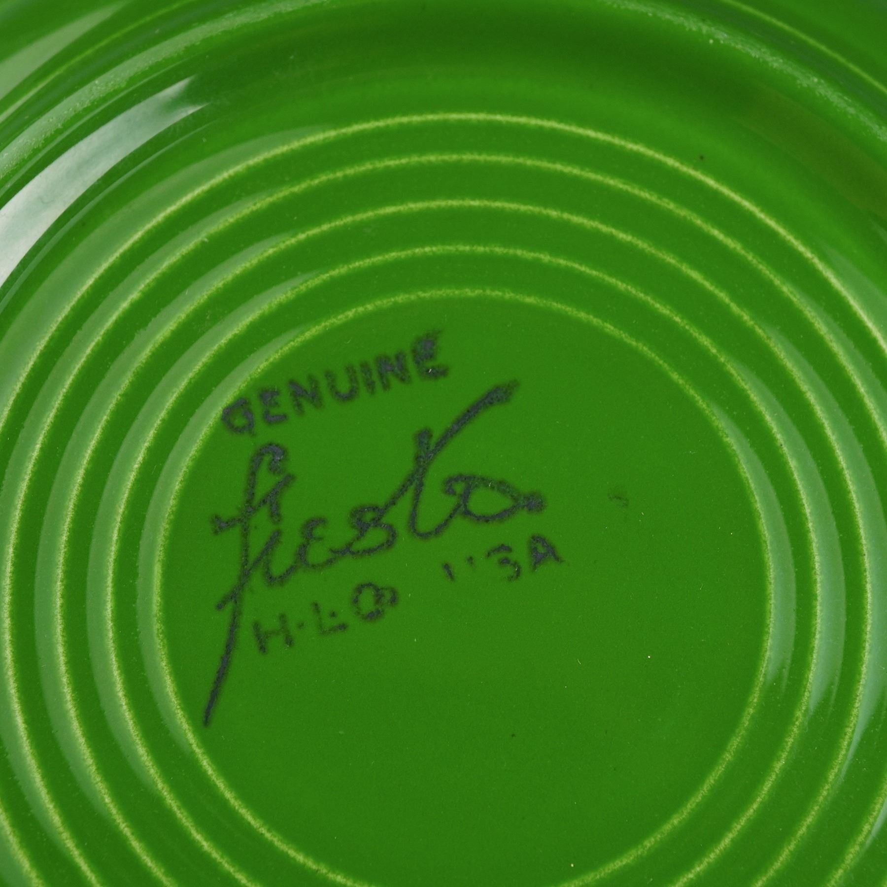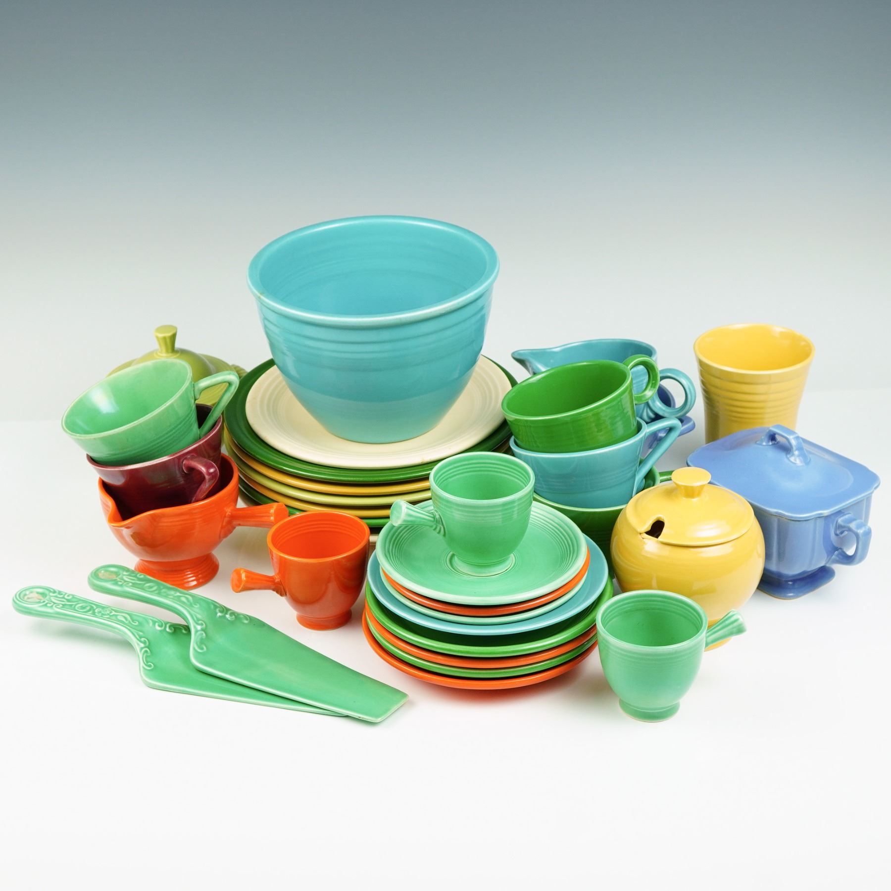 A vibrant multicolor assortment of vintage Fiesta pottery, including bowls, cups, servers, creamers, plates, and lidded pieces in a range of classic colors. The set features signature ring patterns and includes several early examples marked HLC USA, consistent with mid-century production. A total of 36 pieces including lids are represented, comprising 6 soup bowls, 5 tea cups, 2 creamers, 2 lidded sugar bowls, 1 open handled mini bowl, 1 tumbler, 1 large bowl, 1 dessert plate, 8 saucers of slightly varying sizes, 3 demitasse cups, 2 cake servers, and 1 lidded mustard jar. Soup bowls: 8.25" dia., Tea cups: 2.75"H., Creamers: 3"H., Lidded sugar bowls: largest 6"L x 4"H., Handled mini bowl: 2.75"H., Tumbler: 4.5"H., Large bowl: 4.25"H x9.75"dia., Dessert plate: 7.5"dia., Saucers: largest 6" dia., Demitasse cups: 2.5"H., Cake servers: 9.5"L., Mustard jar: 4.5"H.