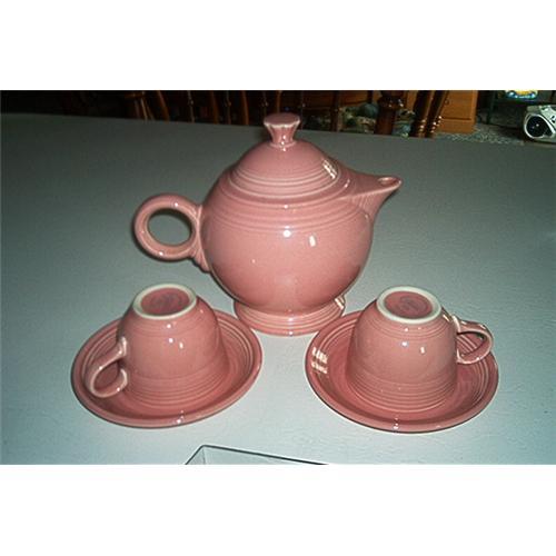 Teapot, coffee cups, and saucers by Fiesta. Post 1986. Rose Color. Teapot has wide opening. The bottom of the teapot is embossed: FIESTA-Made In USA, along with the Fiesta Emblem. The two coffee cups and two saucers are stamped in blue: Homer Laughlin china Co. Genuine Fiesta-USA-LLS-Lead Free. Rings around the top edges and bottom edges. Excellent Condition.