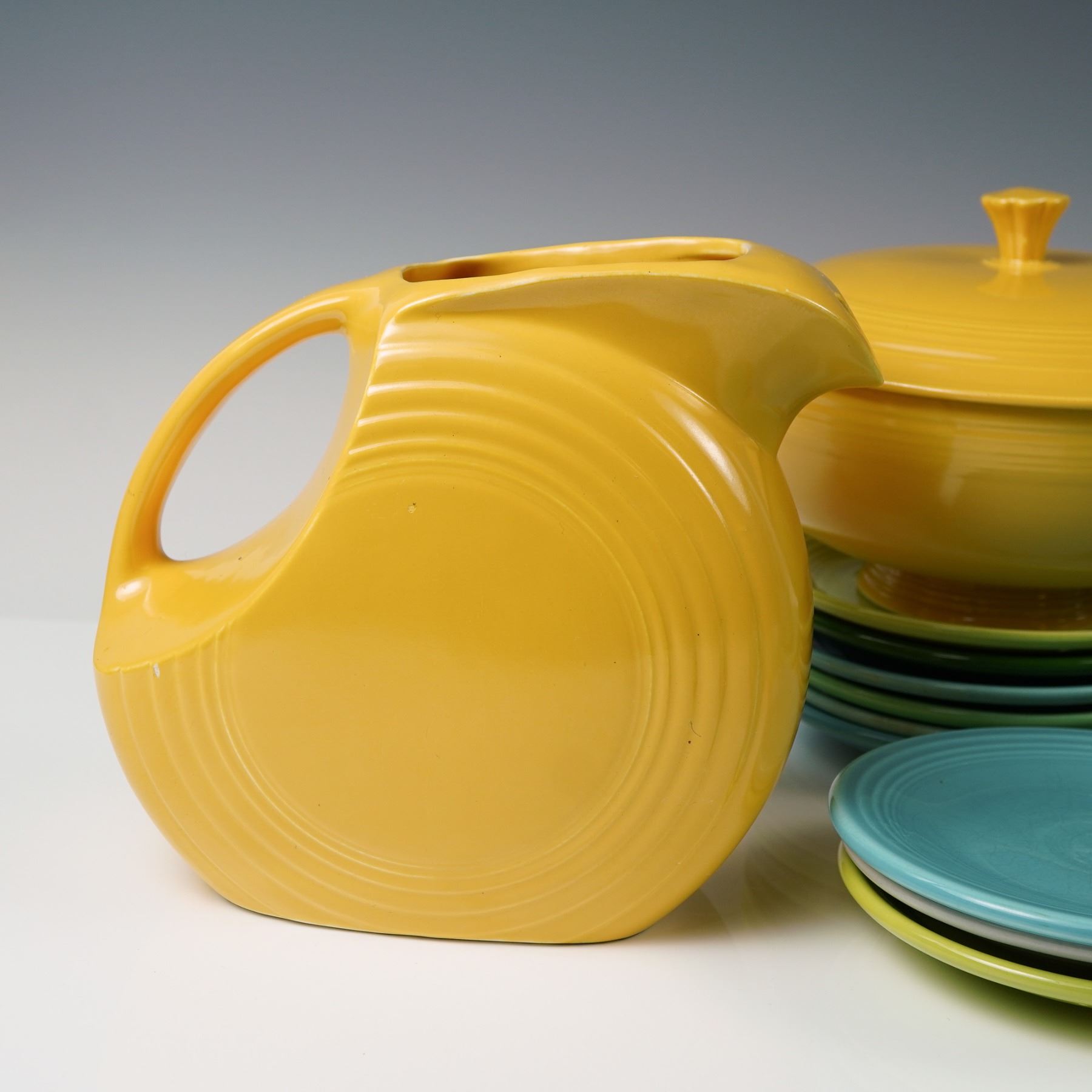 A vibrant 24-piece collection of vintage Fiesta dinnerware, including two hard-to-find charger plates, one iconic marigold disk water pitcher, and one matching marigold covered casserole dish with scroll handles. Accompanied by a colorful mix of 20 small plates in classic Fiesta hues including turquoise, green, yellow, and persimmon. Each piece bears the impressed or ink Fiesta mark, Made in USA. This lot showcases the timeless Art Deco-inspired concentric ring design synonymous with Fiesta ware. Some pieces show light surface wear consistent with age. A striking and functional set for collectors or enthusiasts of mid-century American pottery. Includes 2-charger plates, Marigold pitcher, Marigold casserole dish with lid, and 20 small mixed plates.
