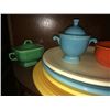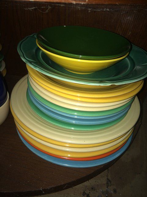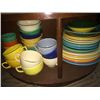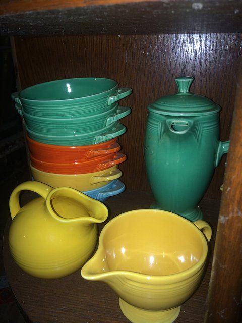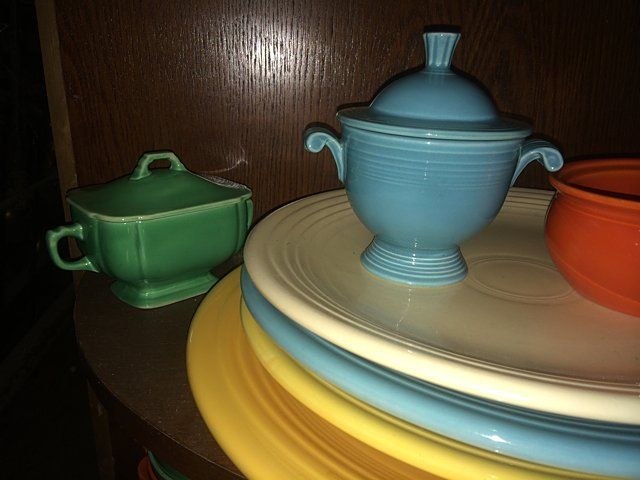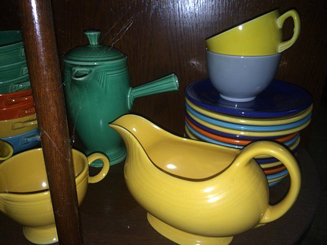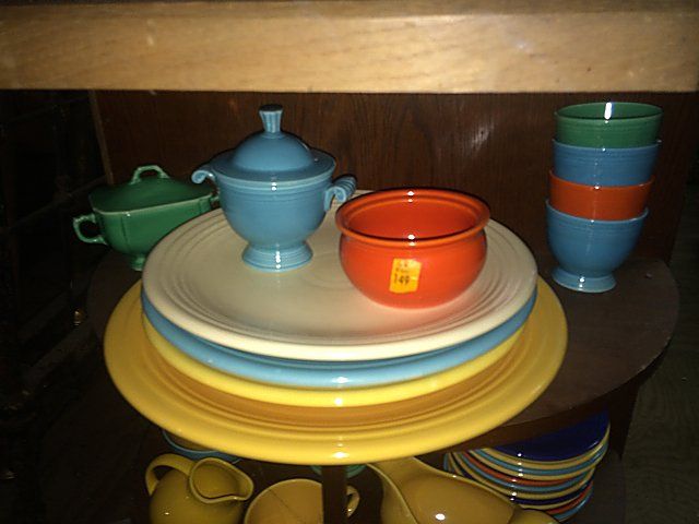 Fabulous Fiestaware! Over 70 pieces of Fiestaware including dinner and dessert plates, creamer, pitcher, and gravy, bowls, sugers, cups and saucers, tea pot, and bowls. A nice mix of wonderful colors!!!
