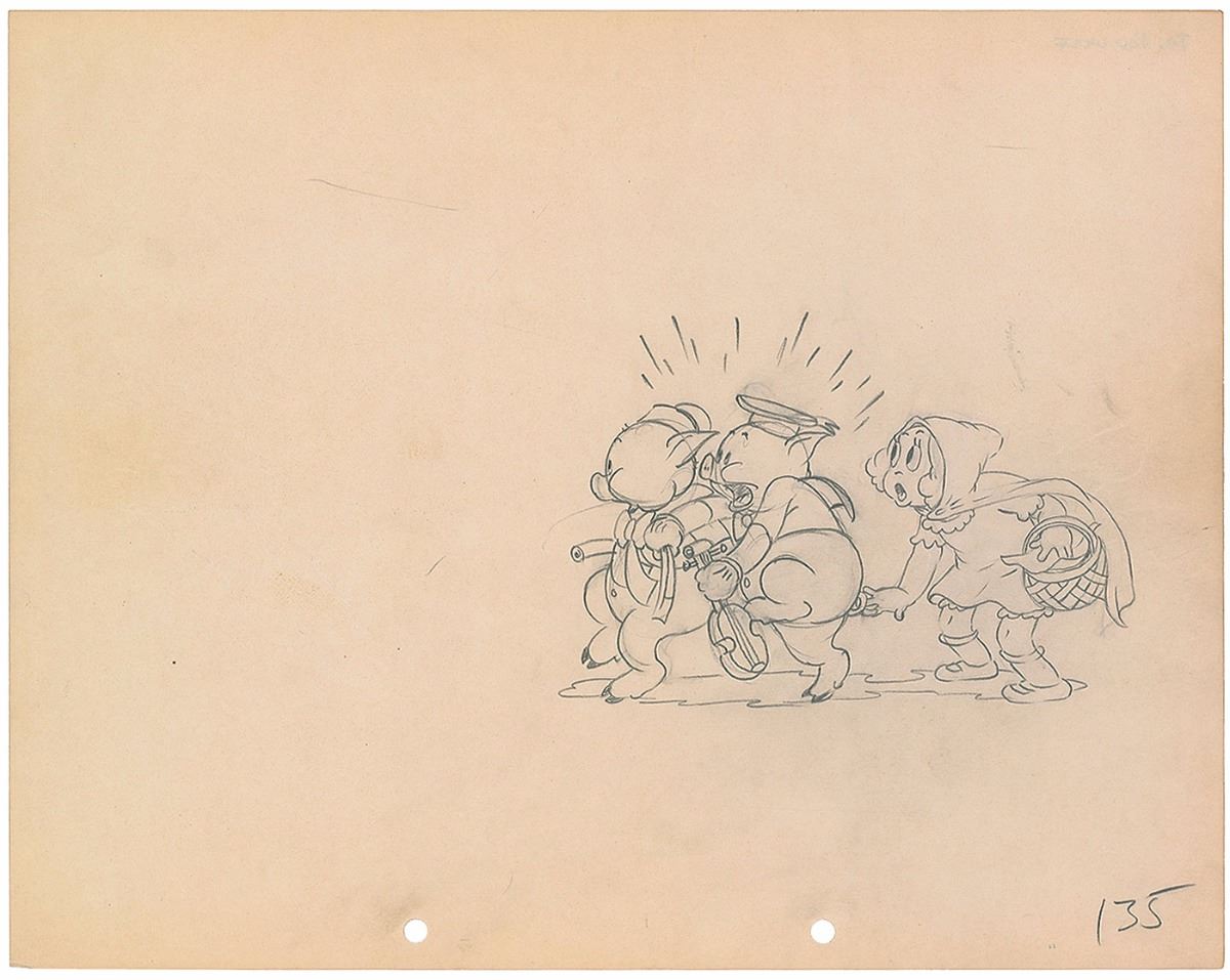 (Walt Disney Studios, 1934) Original production drawing featuring Fifer Pig, Fiddler Pig, and Goldilocks from The Big Bad Wolf. Accomplished in graphite on untrimmed 12 x 9.5 animation paper. Image measures 5.5 x 4. In fine condition.