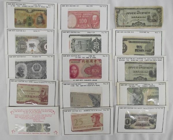 Fifteen Foreign Paper Bank Notes Currency. To include 1- Chile P99, 100 cien pesos, Bank note selection 101/7; 1-China P328, Twenty Customs Gold Units, Bank note selection 101/6, China P85, 10 Yuan 1940-Bank of China, Bank note selection 100/2, China PM25, 5 Yen-1938-Japanese Military Issue of WWII, Bank note selection 100/3; Republic of Biafra P5, one pound, Bank note selection 101/5; Bulgaria P84,25, Bank note selection 101/1; Burma (Japanese Occupation) P11, Ten Rupees, Bank note selection 101/8; Bank Indonesia P90, 1 Sen-1964-Man With Straw Hat at Right, Bank note selection 100/4; P91,93,94 (3 Var.) 5, 25, 50 Lima Puluh Sen, Bank note selection 101/3; Japanese Government, 10 Pesos, torn but in one piece; Malaya (Japanese Occupation) 101/2, One dollar, Bank note selection 101/2; Philippines P111, 10 pesos, Bank note selection 101/4; Philippines P110 (Japanese Occupation)10 Pesos-1942-WWII issue-Plantation Scene at Right, Bank note selection 100/5; Kampuchea P16 (Formerly Cambodia), 500 Riels- 1955,Bank note selection 100/1 3- small paper money, #1-10 Indonesia Sepuluh Sen, #2-one cent Government of Hongkong. #3 unknown oriental paper Most have individual envelopes and are in my opinion Good Condition unless otherwise noted above.