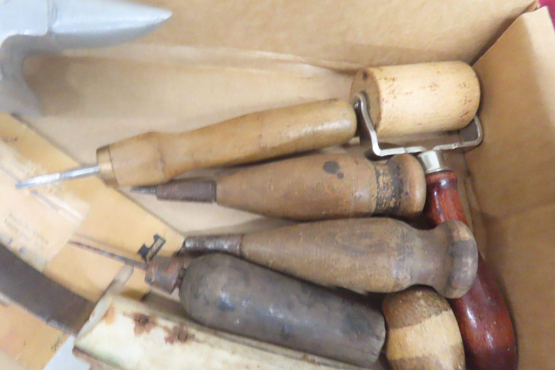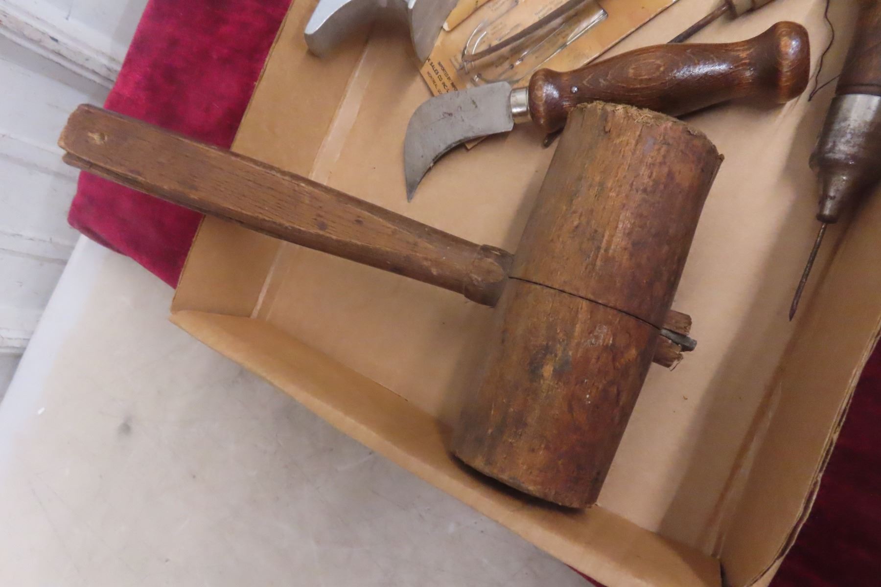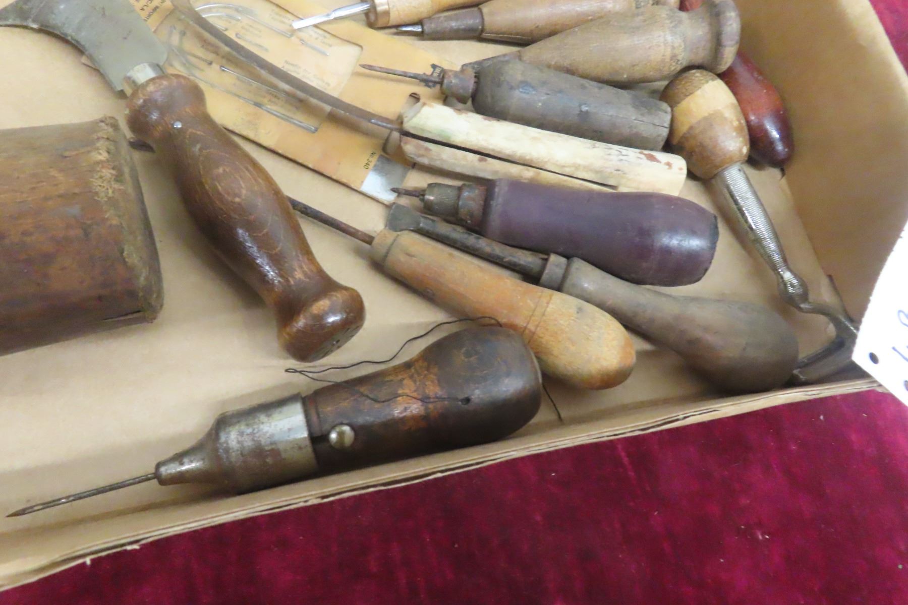 Fifteen Vintage Leatherworking Tools Including Anvil, Hammer, Needles, Awls and Stitcher