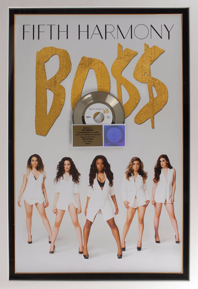 Official serial number hologram-style RIAA gold sales award presented “to Fifth Harmony to commemorate RIAA certified gold sales & streams of more than 500,000 copies of the Epic Records digital single ‘Bo$$.’” Impressively framed with its plate and disc against a background of the single album cover to an overall size of 26.5 x 38.75. Award retains its original backing with a Jewel Box Platinum label. In fine condition, with a ding to lower right edge of frame. Oversized.
