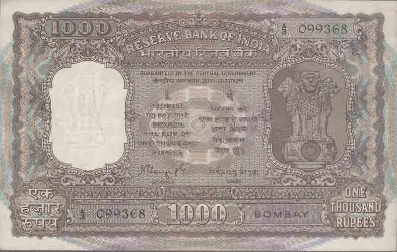Fifth Issue 1000 Rupees of N C Sengupta of Bombay Circle.