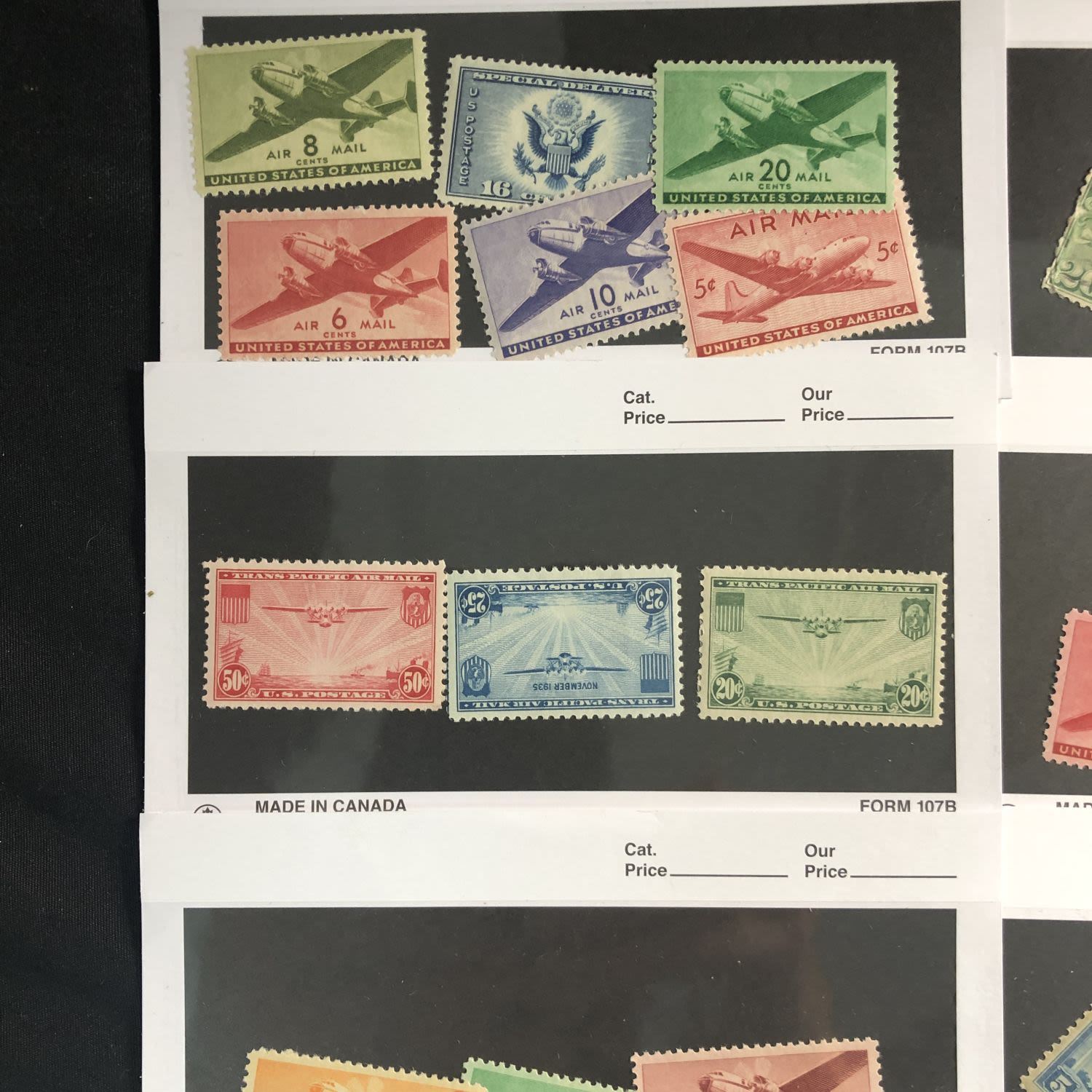A group of over Fifty (50CT) Early US Airmail Stamps in Mint and Used condition. Includes a beautiful mint set of 1937 Mosquito Planes and a Mint set of 1941 Transports. A really fun group of US Airmails.