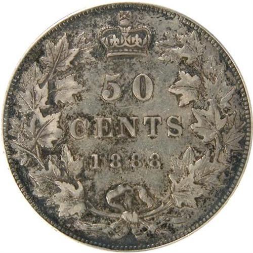 Canada Fifty Cents 1888 Obverse 3 PCGS VF-35. This is a sharp example with light golden gray toning with light-medium blue and slate accents