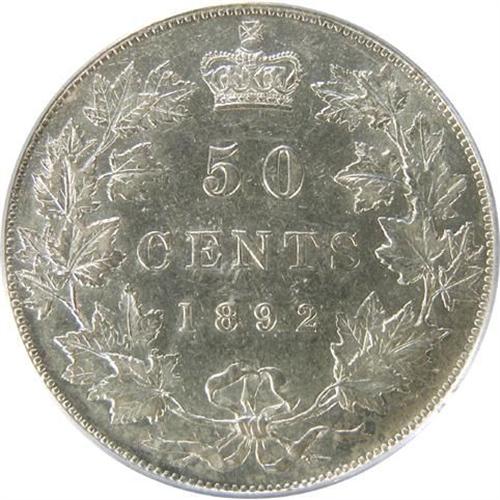 Canada Fifty Cents 1892 Obverse 4, PCGS AU-53. This is a very sharp pale golden toned piece with much remaining lustre. It is tied with two other examples with only ten pieces graded higher by PCGS