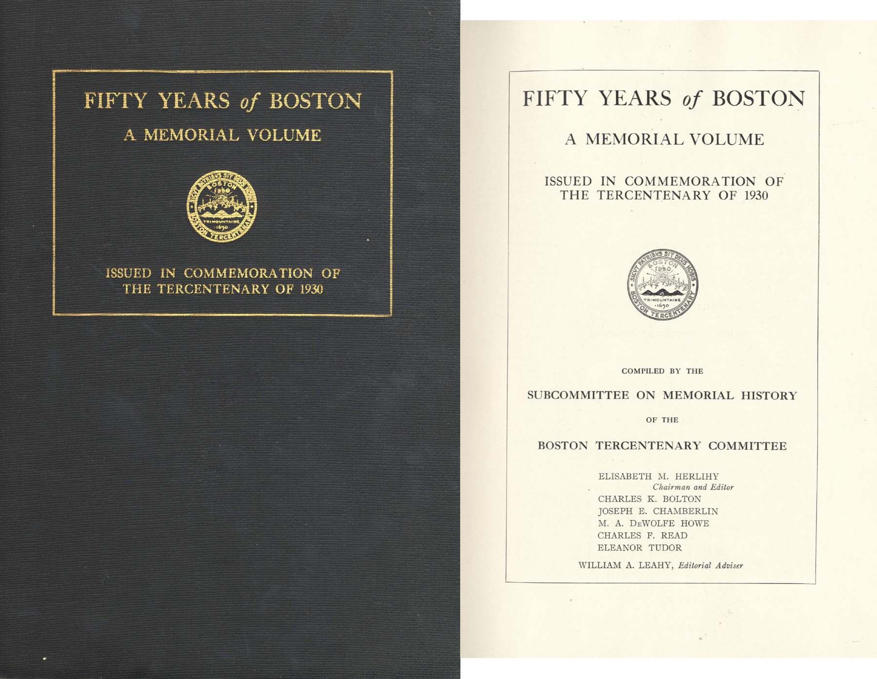 ''Fifty Years of Boston: A Memorial Volume Issued in Commemoration of the Tercentenary of 1930.'' Boston: Subcommittee on Memorial History of the Boston Tercentenary Committee: 1932. Hardcover. Black and white photos, illustrations and maps. Chapters include: ''Music,'' ''Architecture,'' ''Medicine,'' ''The Roman Catholic Church,'' ''Judaism,'' ''The Boston Park System'' and ''Military and Naval Record.'' Book, measuring 8'' x 11'', runs 800pp. Some wear to gilt-adorned black boards, pencil notes on ffep, mild toning to endpages. Very good condition.