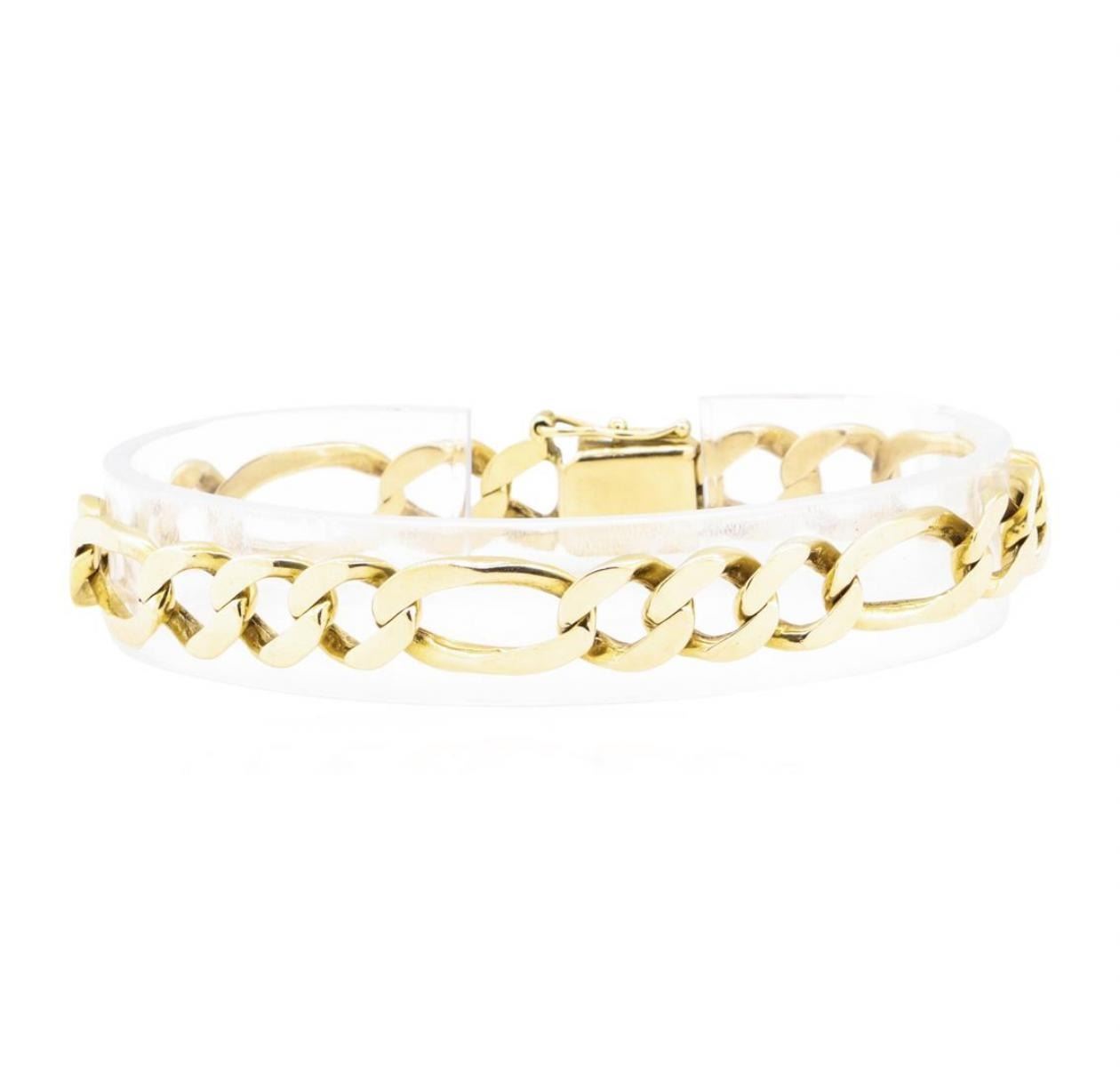 One Figaro link bracelet measuring approximately eight inches in length and 9mm in width featuring: 18KT yellow gold weighing 28.0 grams.