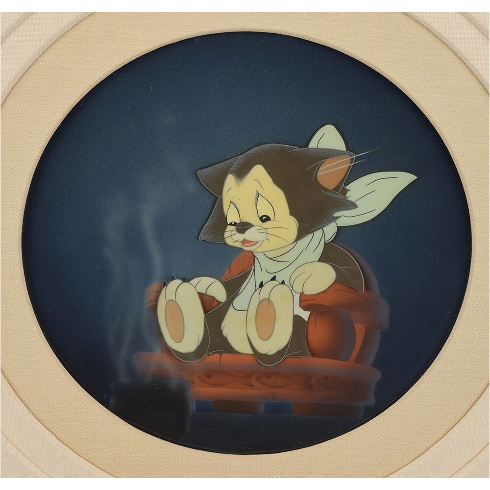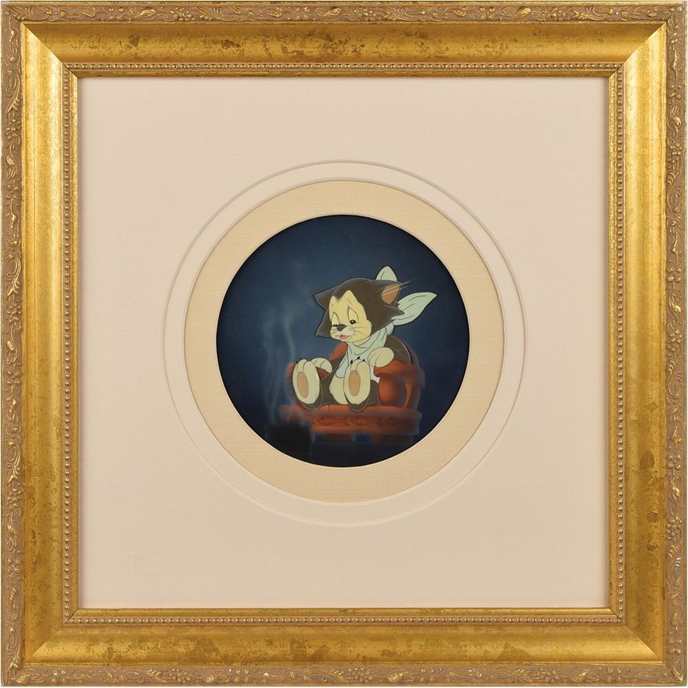(Walt Disney Studios, 1940) Original production cel featuring Figaro from Pinocchio, showing Geppetto's pet kitten wearing a handkerchief and sitting in a high chair. The cel has been trimmed and applied to a hand-painted background as prepared by Courvoisier Galleries for sale. Image measures 4 x 3.75, with a mat opening of 7Ë in diameter. Archivally cloth-matted and framed to an overall size of 18.75 x 18.75. In fine condition. Figaro was Walt Disney's favorite character in Pinocchio. He adored the kitten so much that once production on Pinocchio was completed, Disney made him the pet of Minnie Mouse, replacing Fifi the Peke.