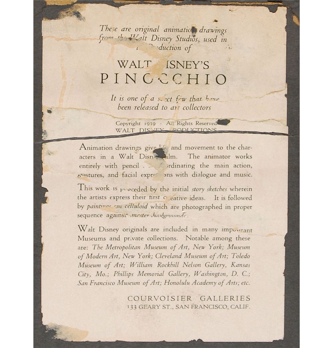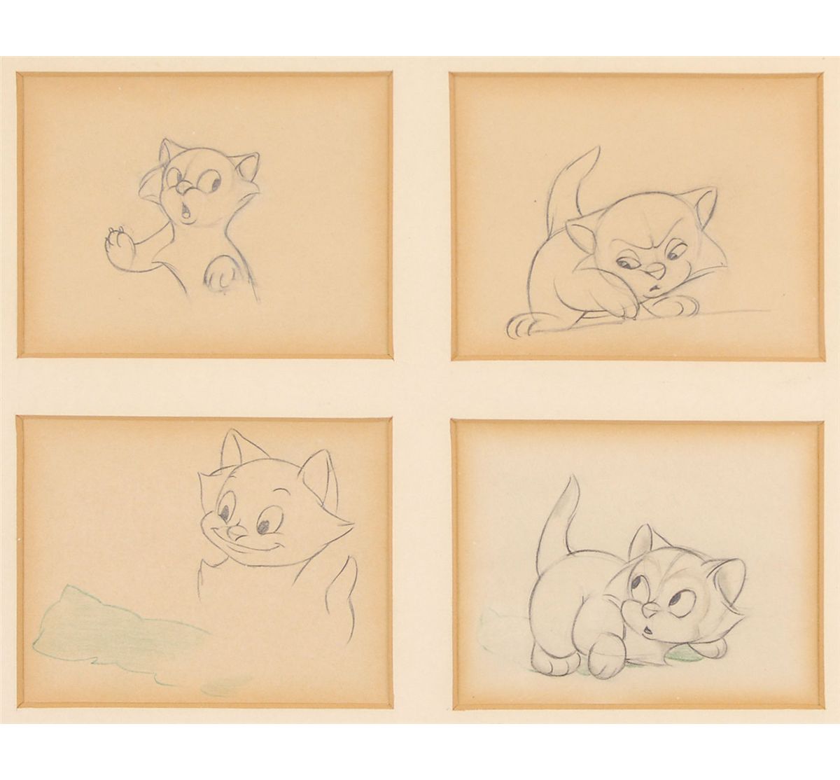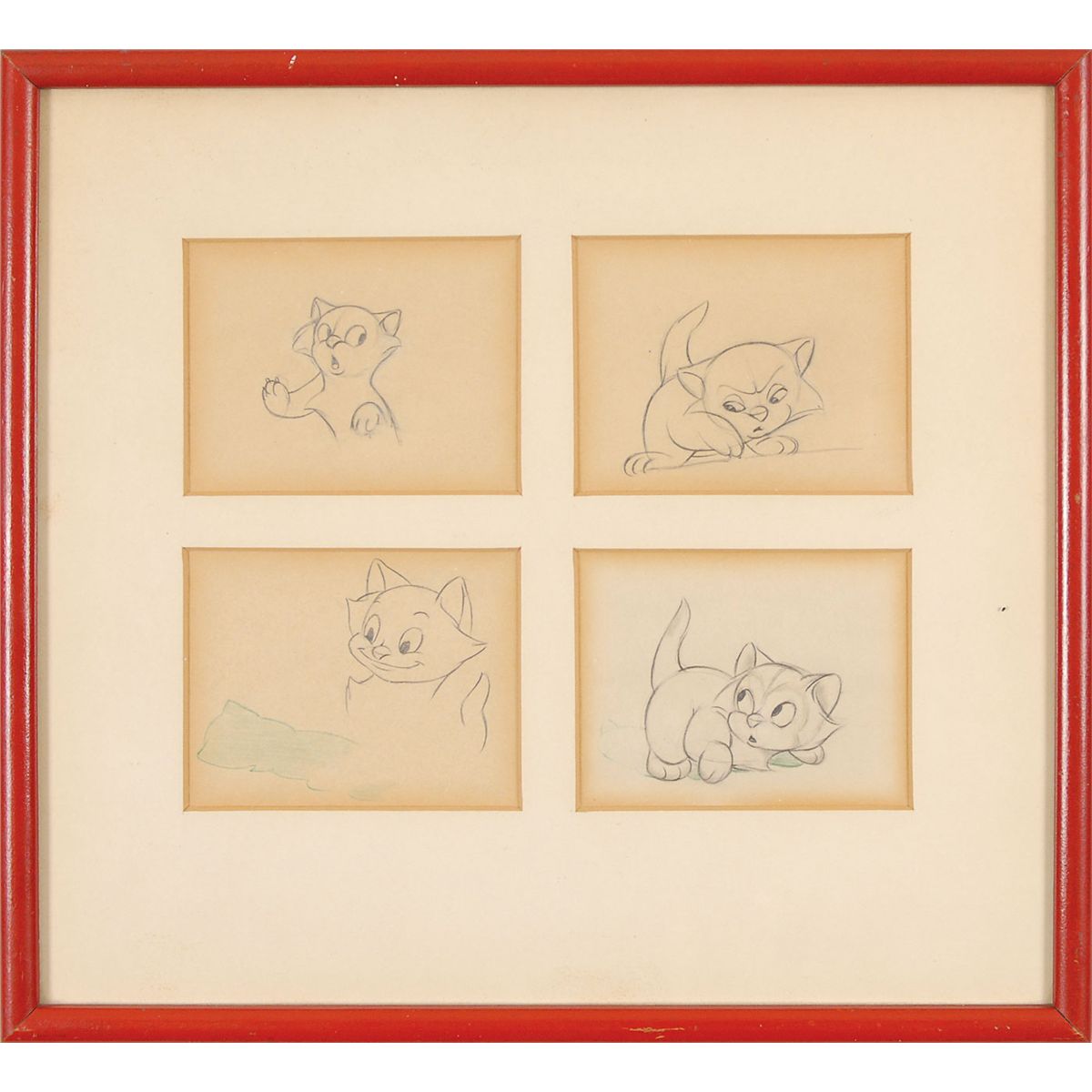 (Walt Disney Studios, 1940) Set of four original preliminary production drawings featuring Figaro from Pinocchio. Accomplished in graphite and colored pencil on four slips of 3 x 2.5 animation paper. This piece is also framed to an overall size of 10.5 x 9.5. These drawings were trimmed and sold at the Courvoisier Galleries in 1940, and the backing retains the affixed Courvoisier Galleries label. In fine condition.